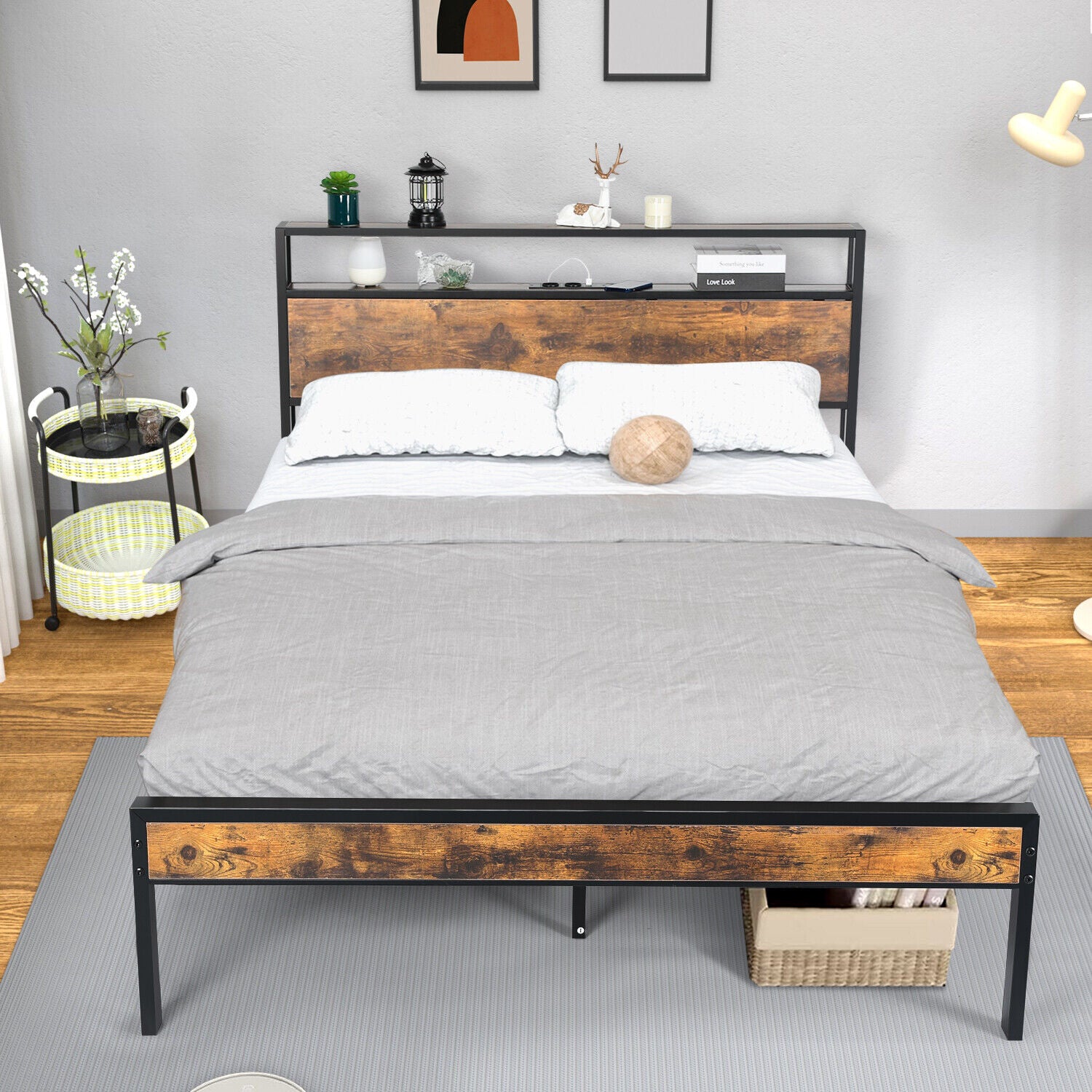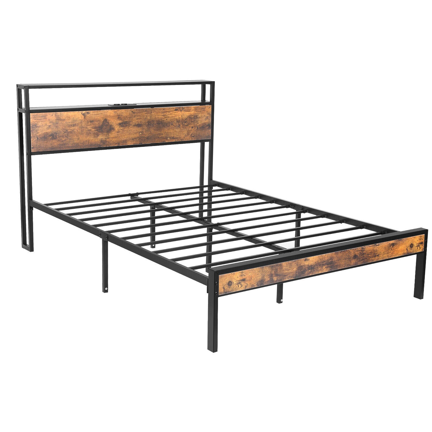 4ft6 Metal Bed Frame with Wood Headboard and Footboard/Heavy Duty Slat Support
