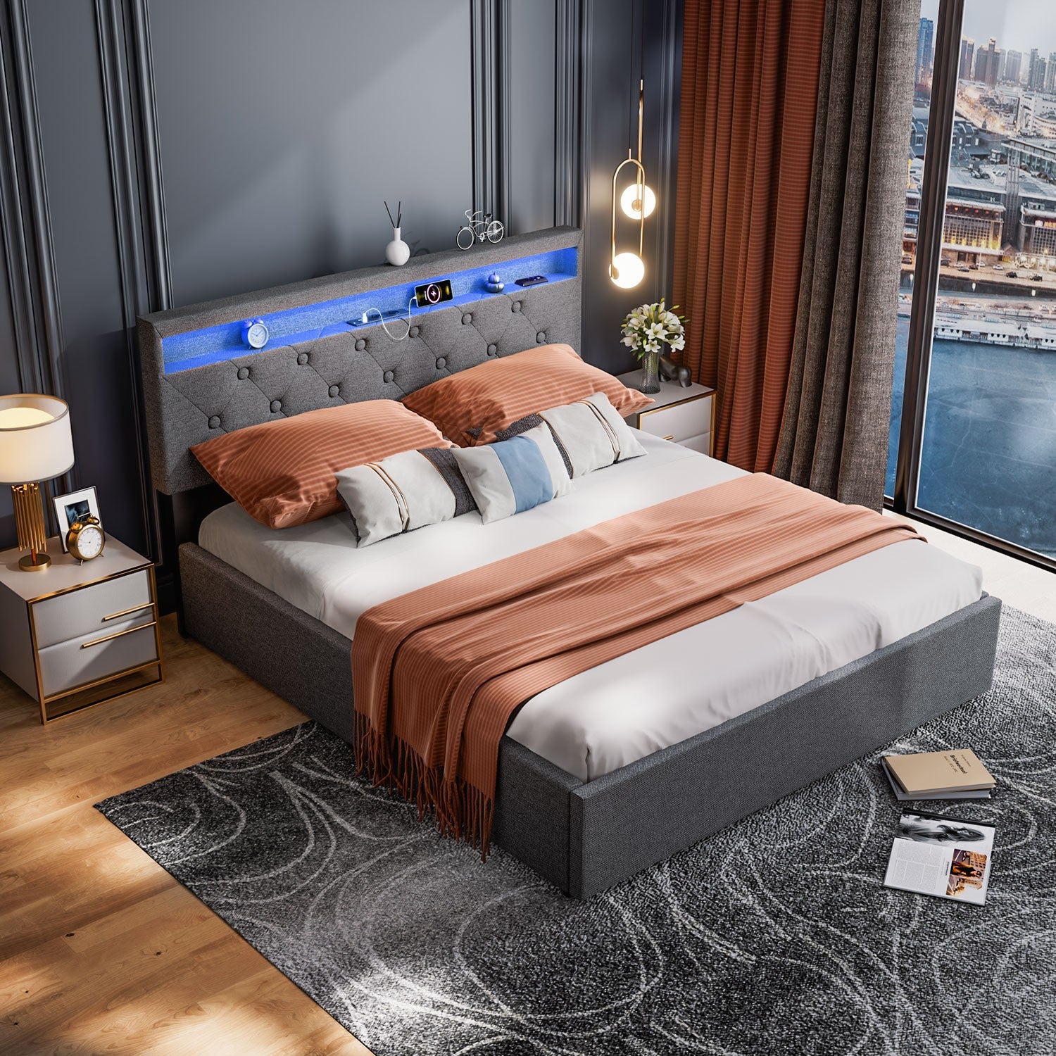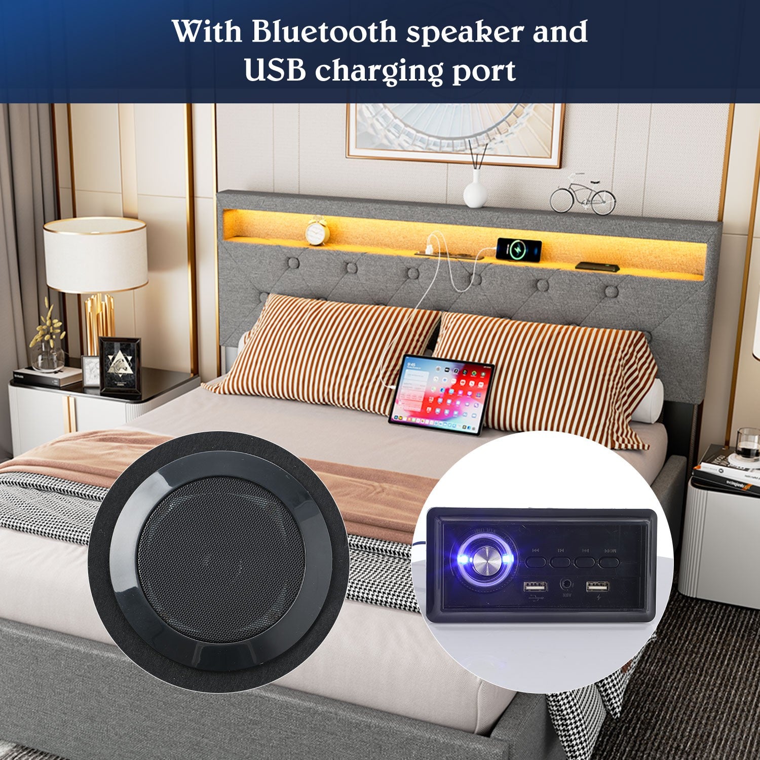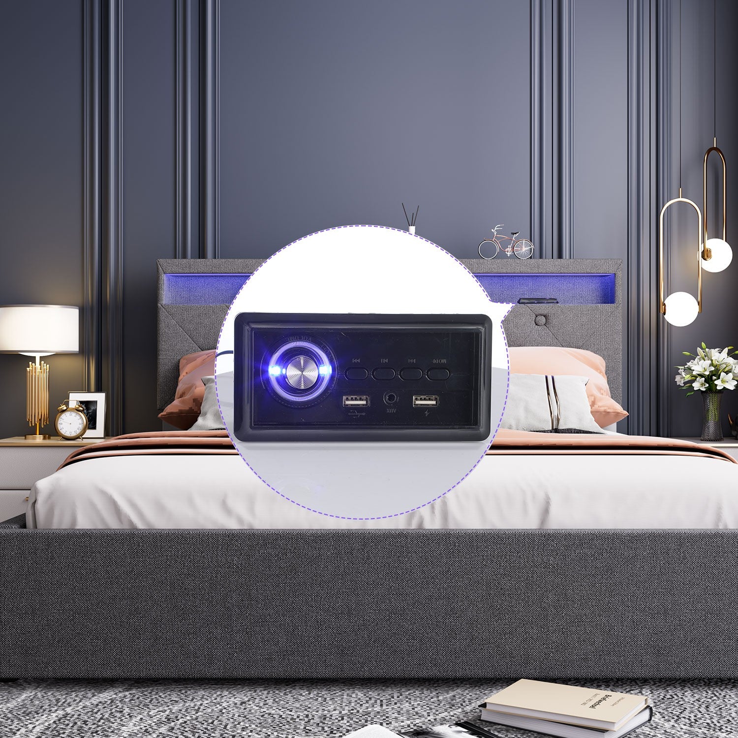 BED FRAME, With Charging Port, With RGB Led Light Strip, LED Light, Storage Headboard, Bluetooth Speaker