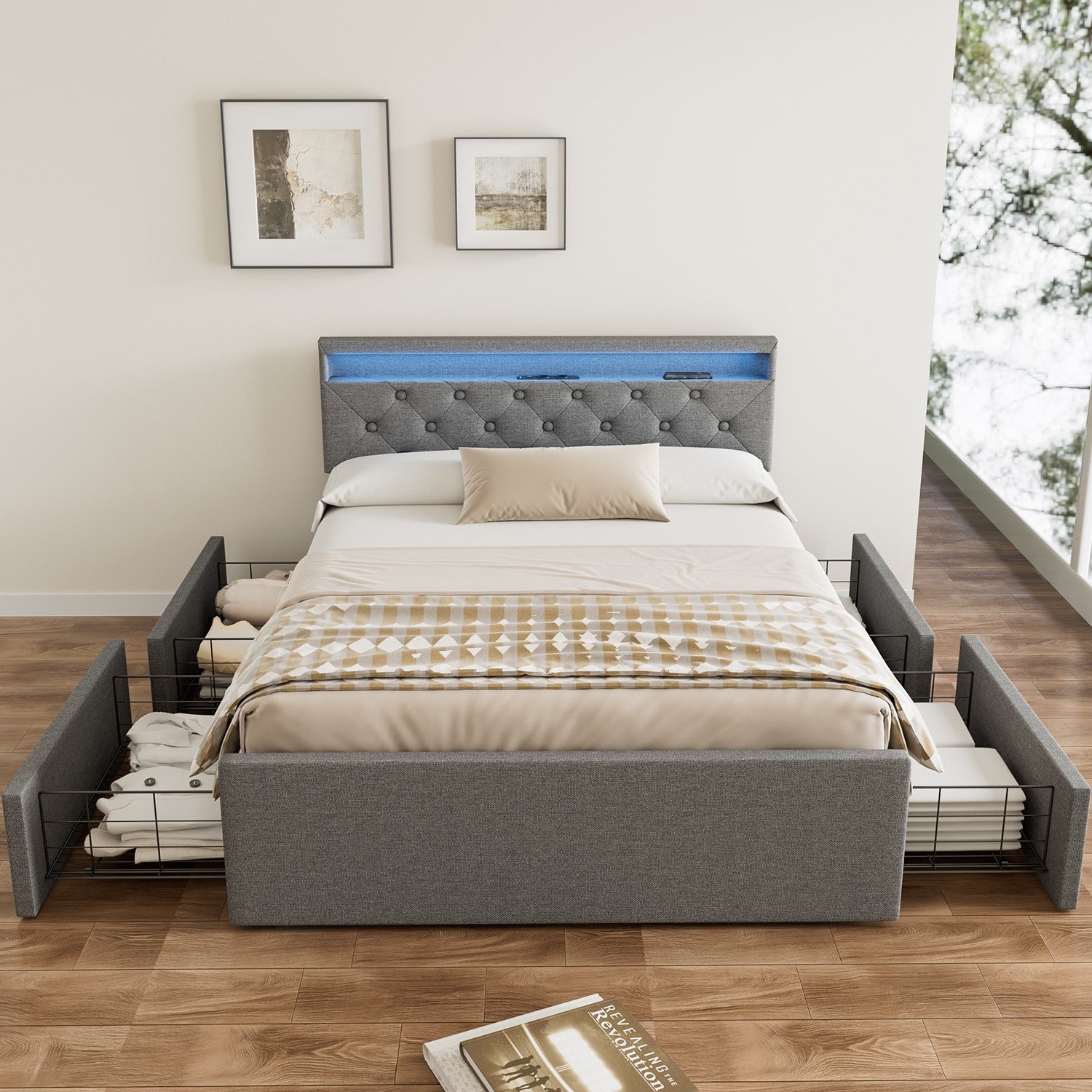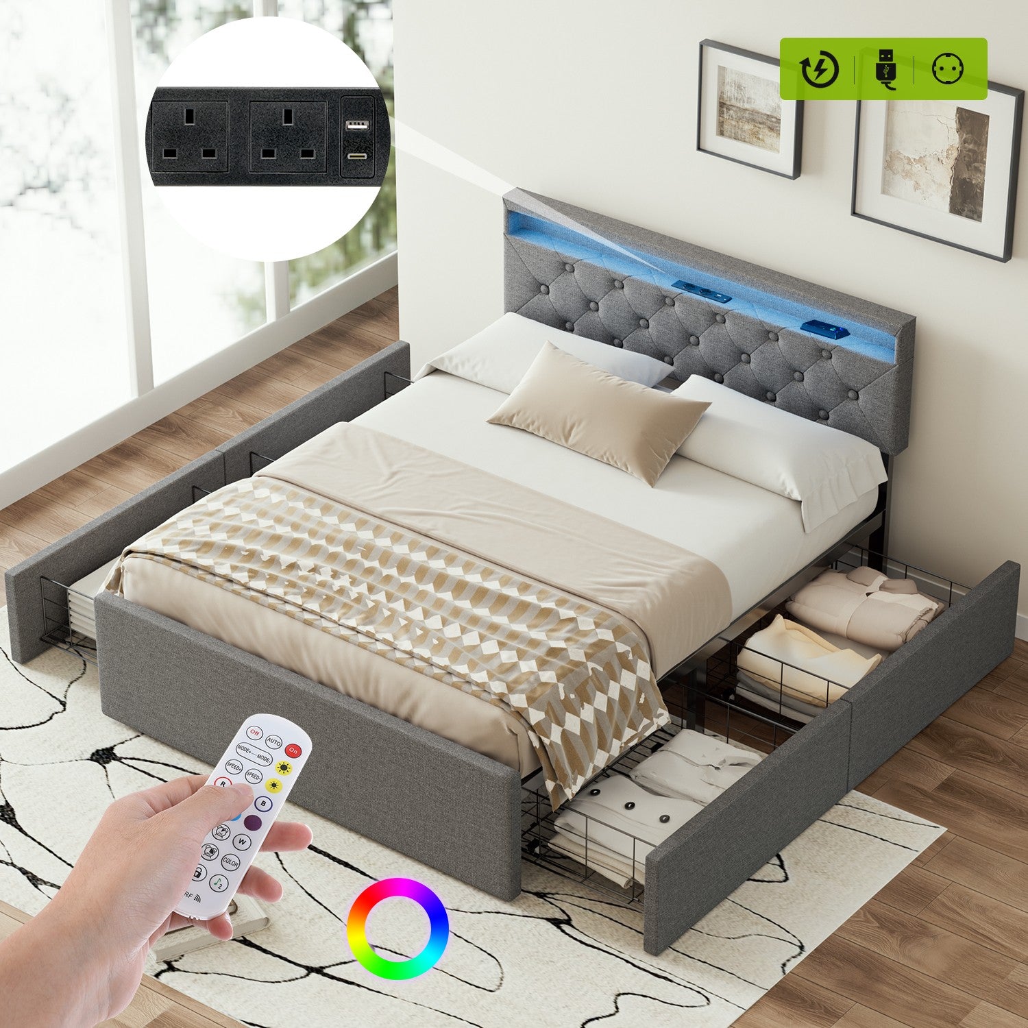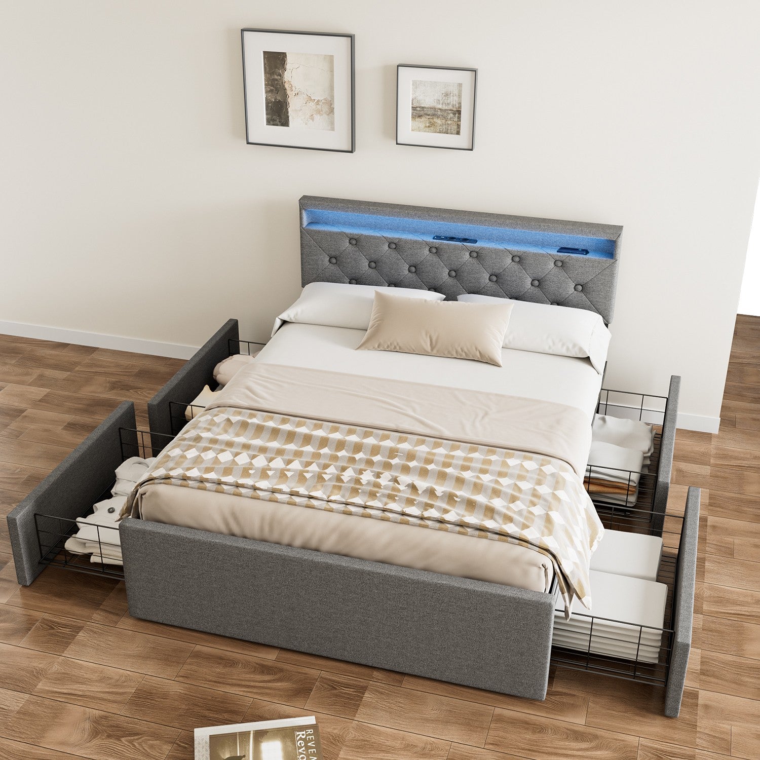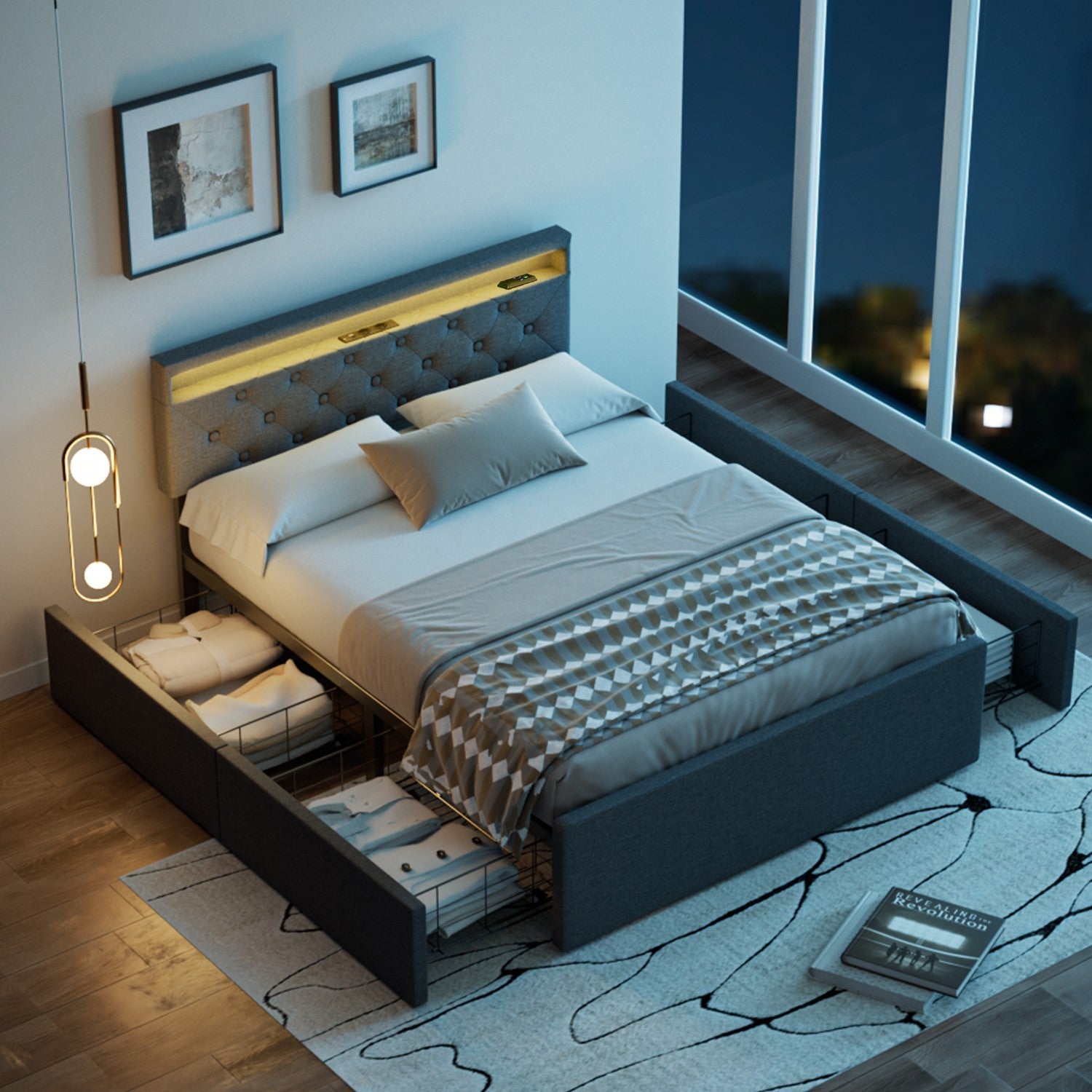 BED FRAME, With Charging Port, With RGB Led Light Strip, LED Light, Storage Headboard, Bluetooth Speaker
