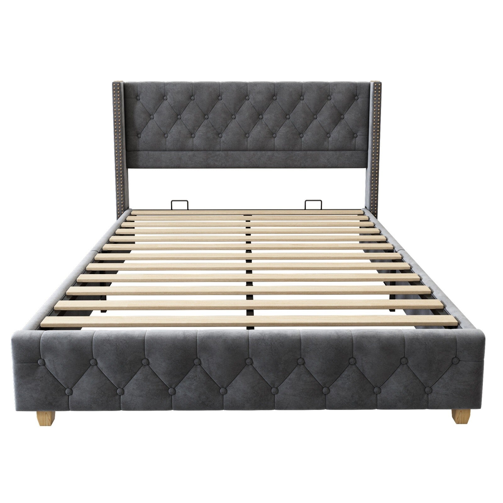4FT6 UPHOLSTERED DOUBLE BED FRAME WITH VELVET TUFTED HEADBOARD & WING SIDE GREY