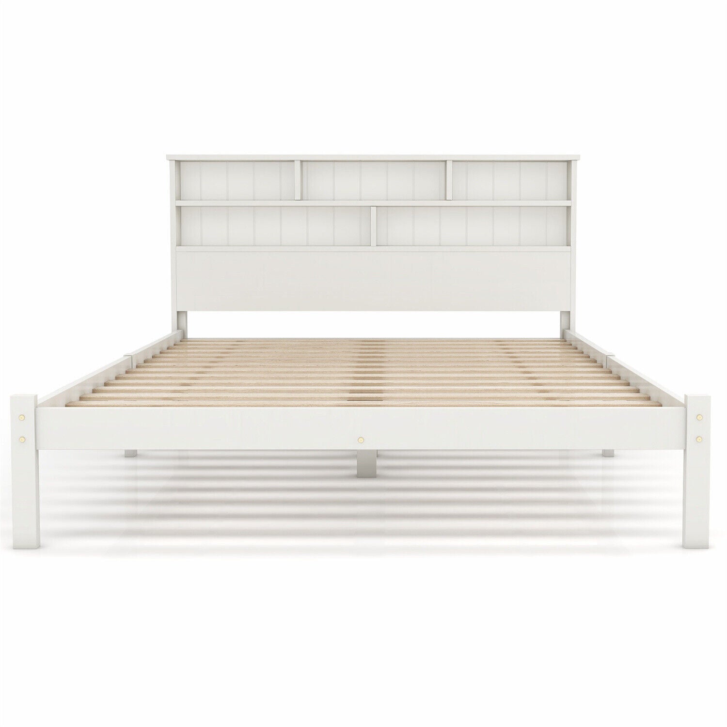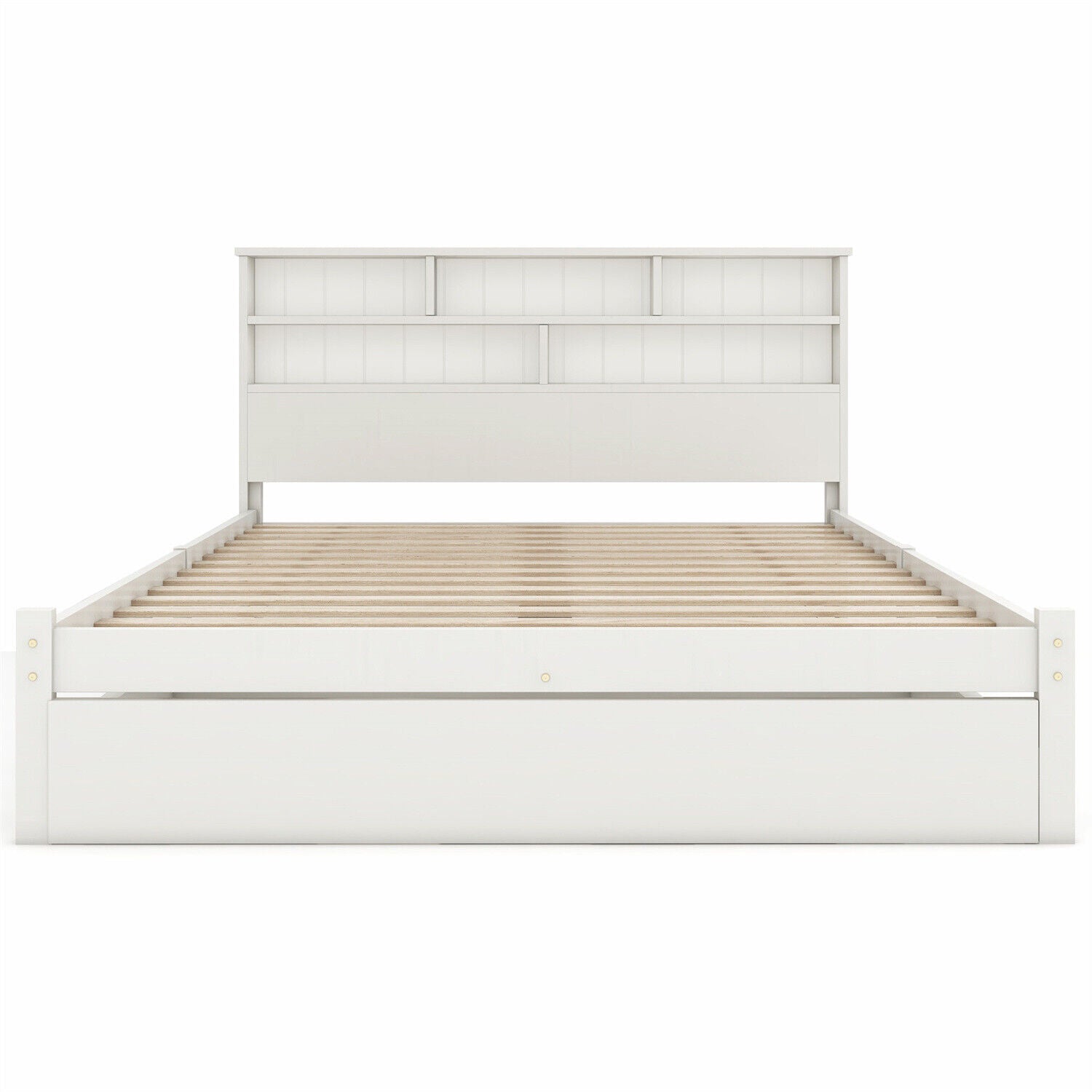 4FT6 White Wooden Double Bed Pine Wood Bed Frame with Storage Drawer & Shelves