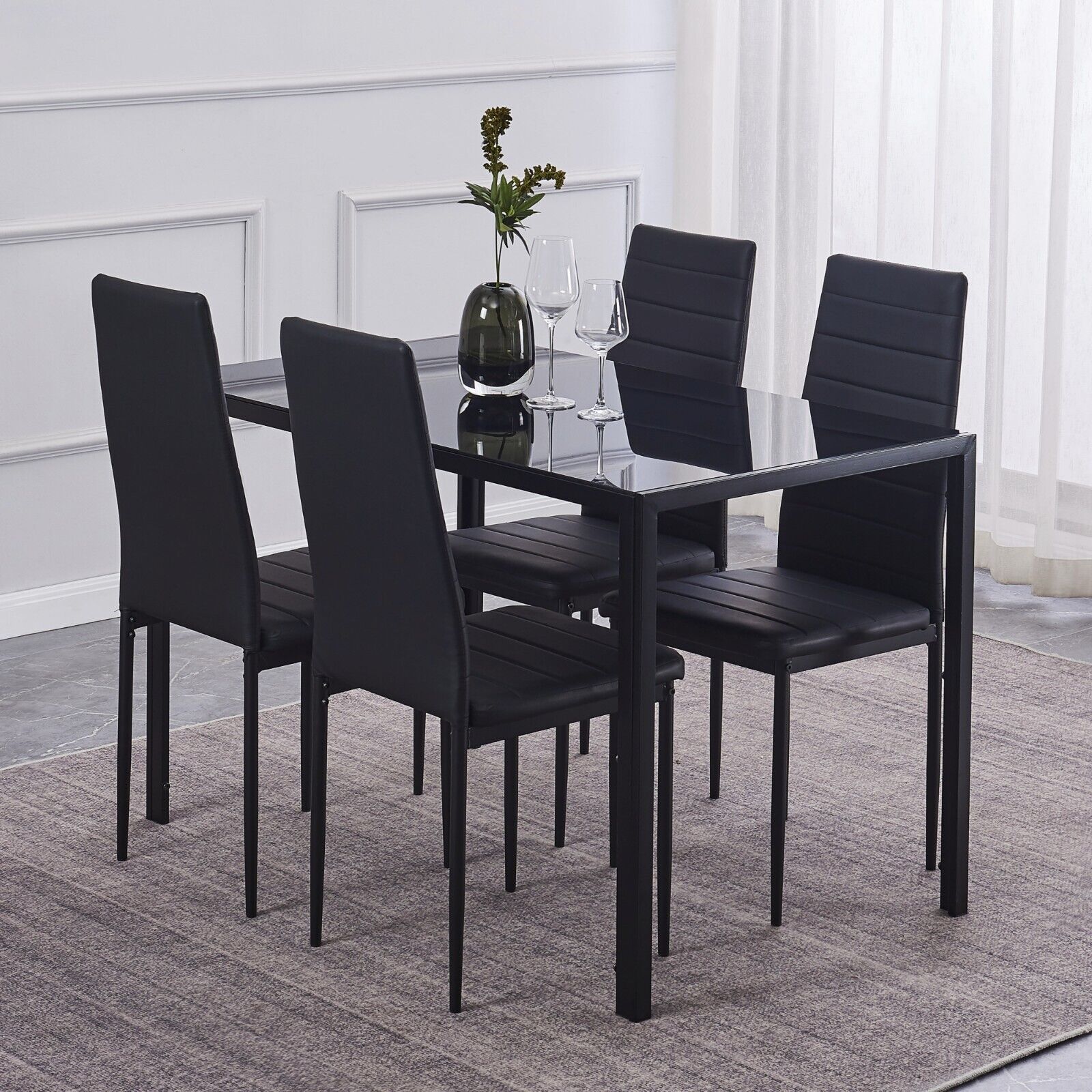 4pcs Black Faux Leather Dining Chairs with Black Tempered Glass Dining Table Set