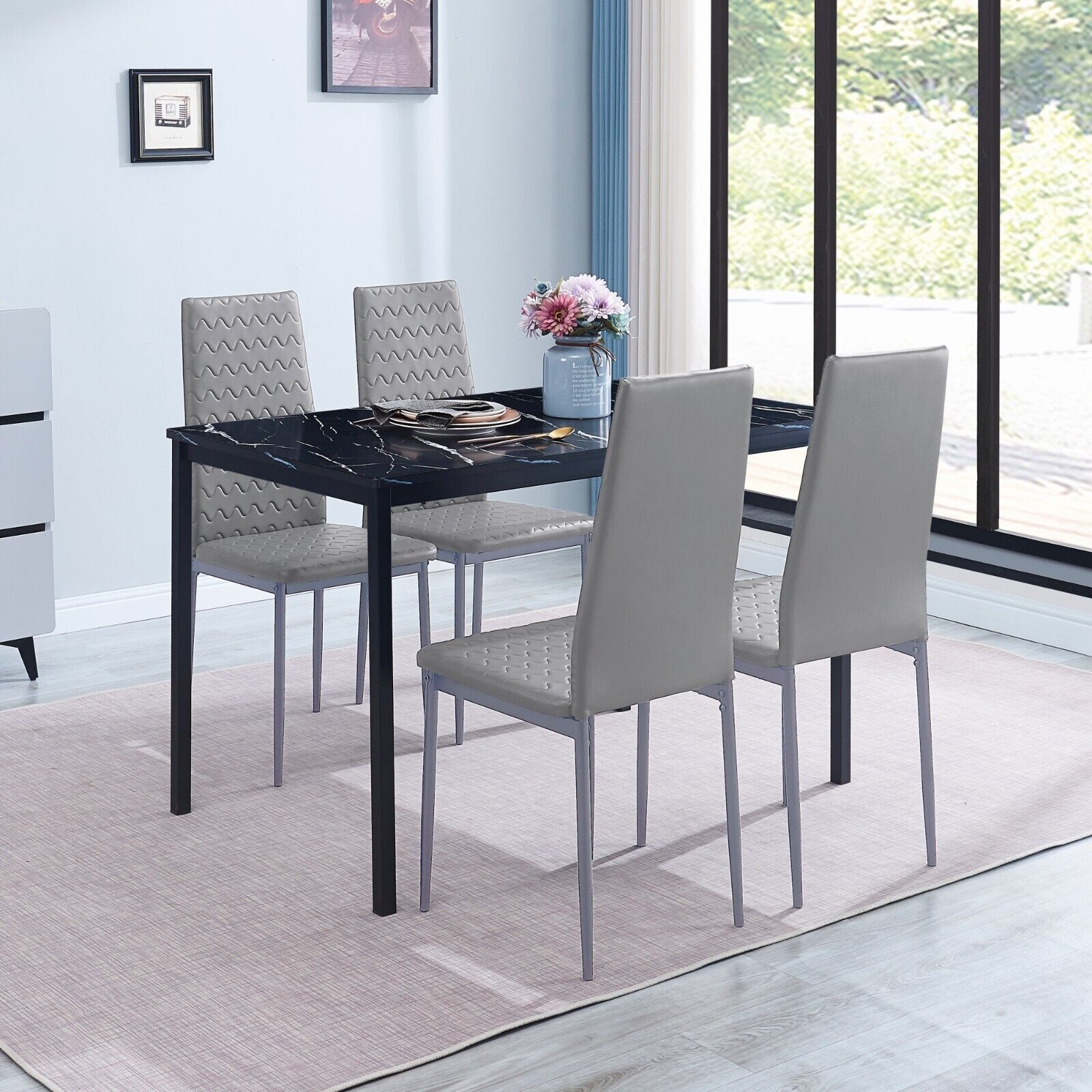 4pcs Grey Faux Leather Dining Chairs & Black Marble MDF Top Dining Table Set
