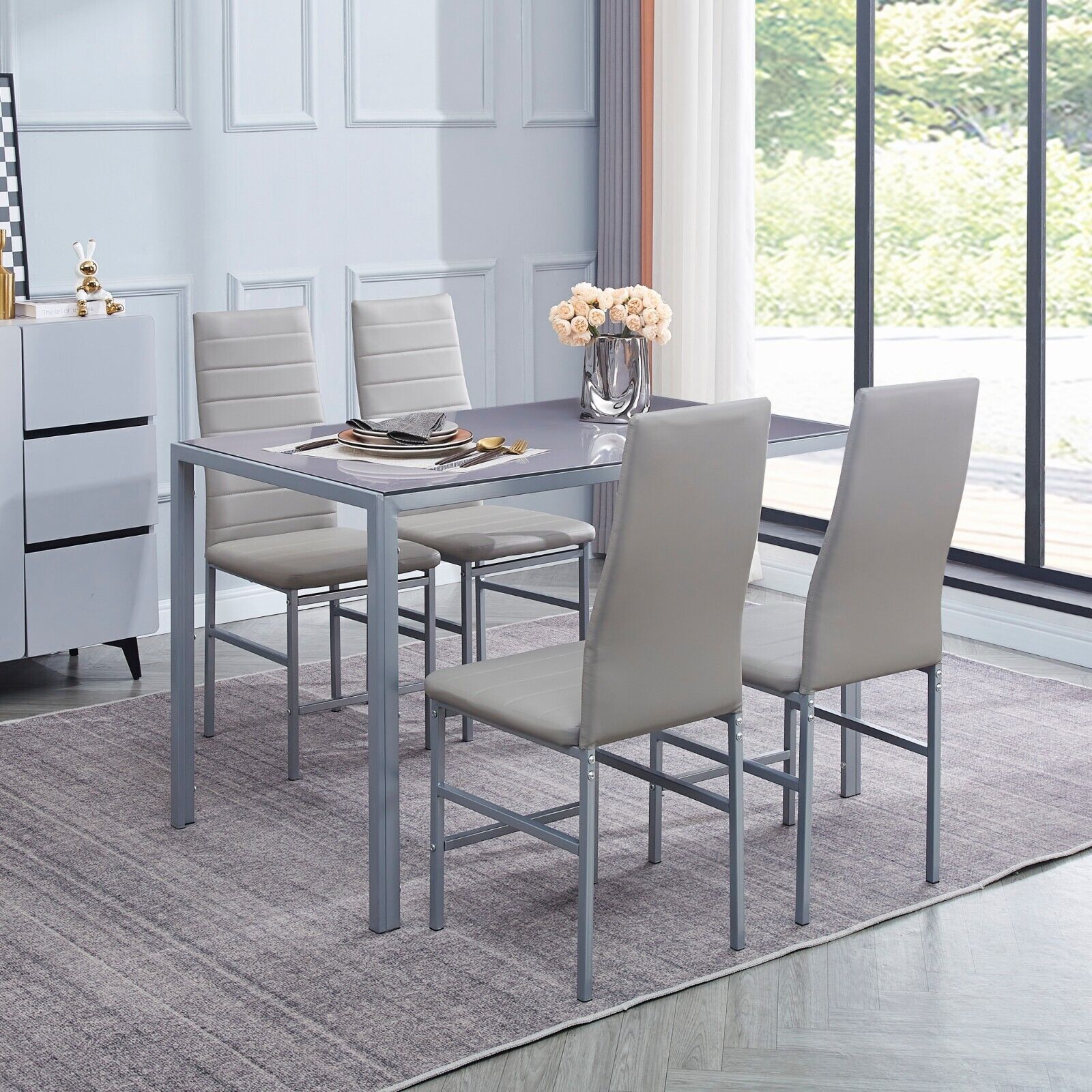 4pcs Grey Faux Leather Dining Chairs Footrest Legs & Grey Glass Dining Table Set