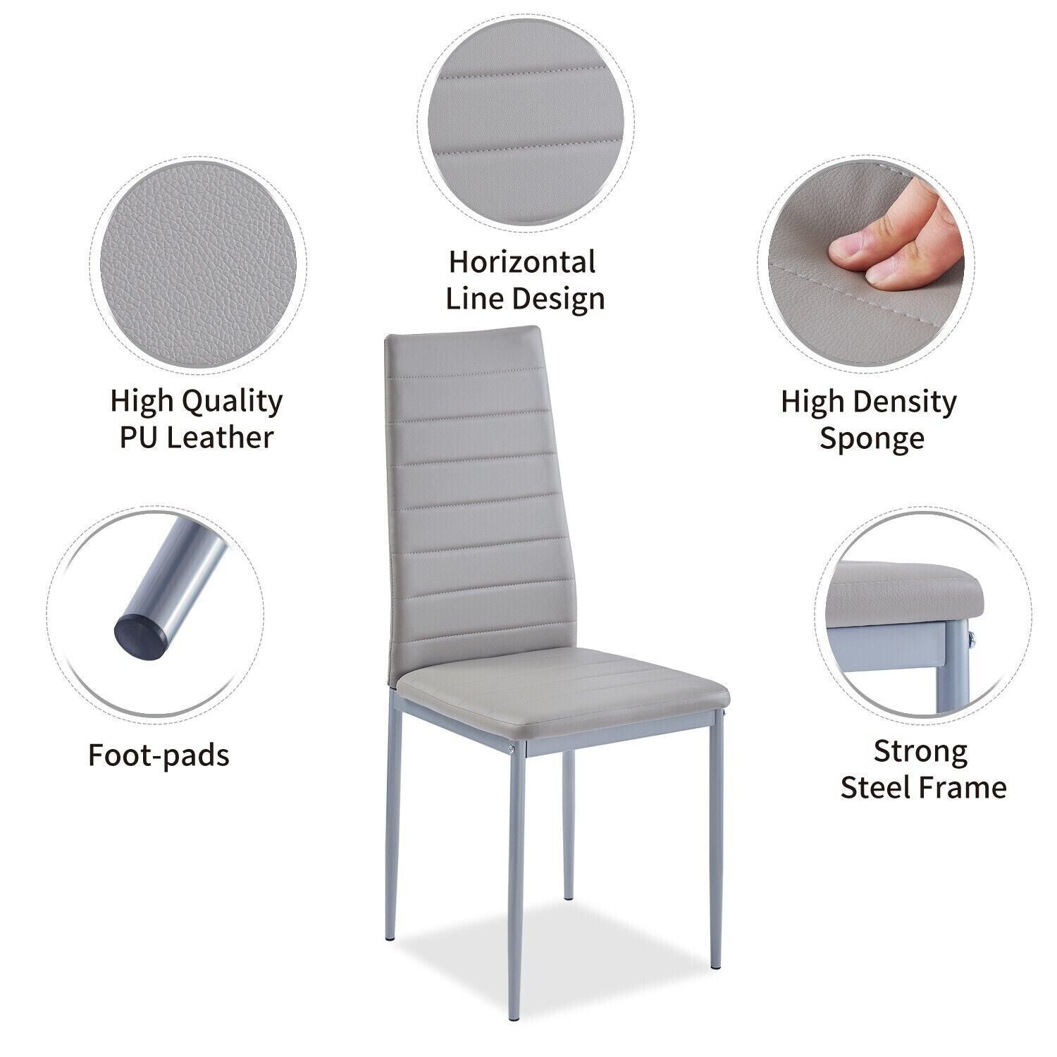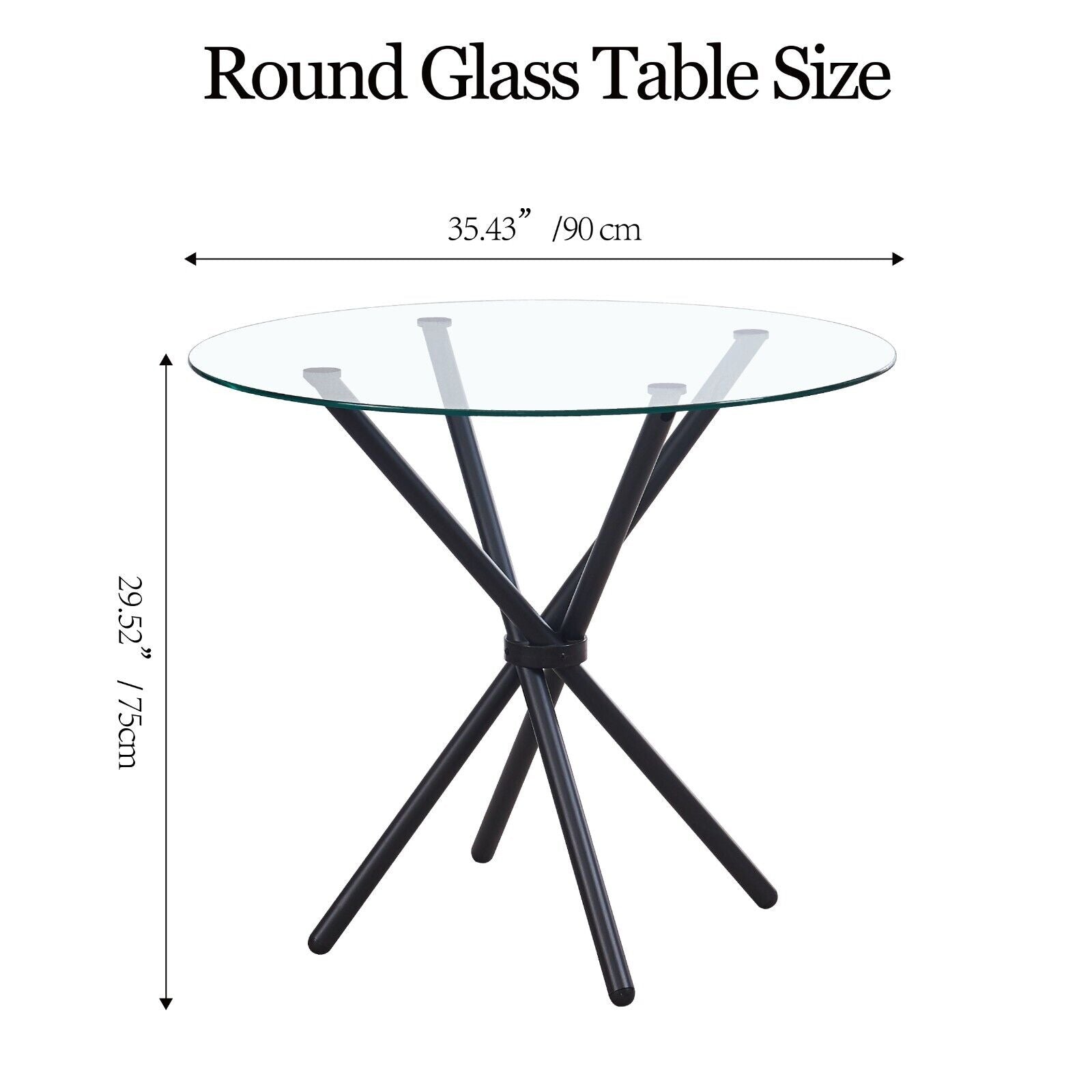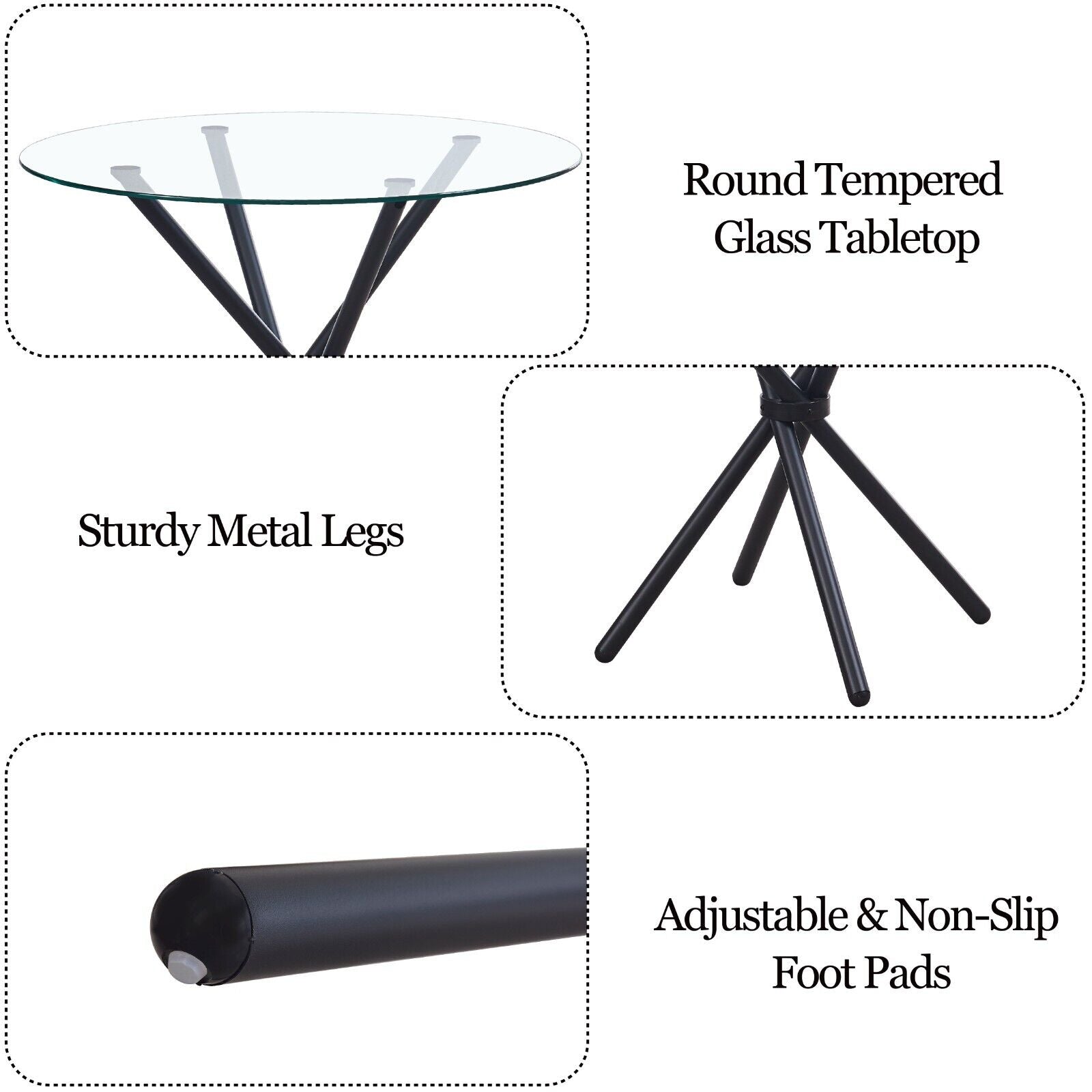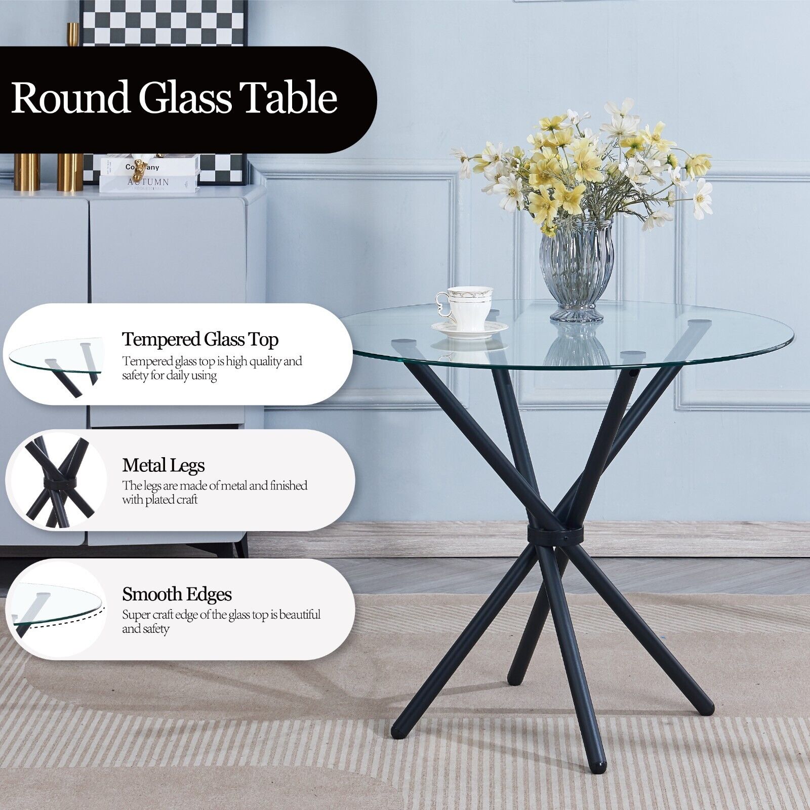 4pcs Grey PU Leather Dining Chairs & Round Clear Glass Dining Table Black Legs