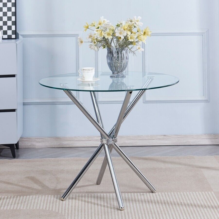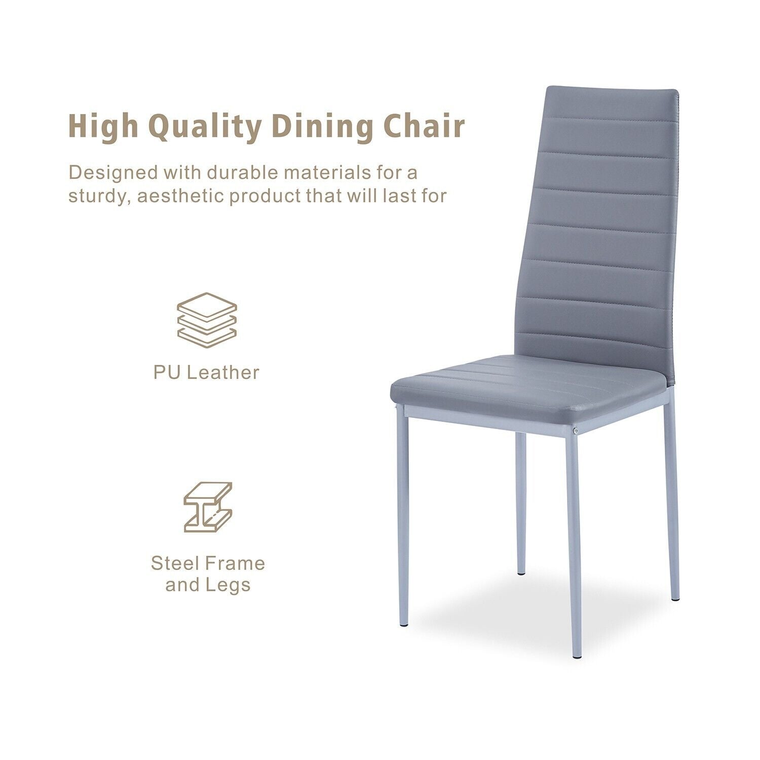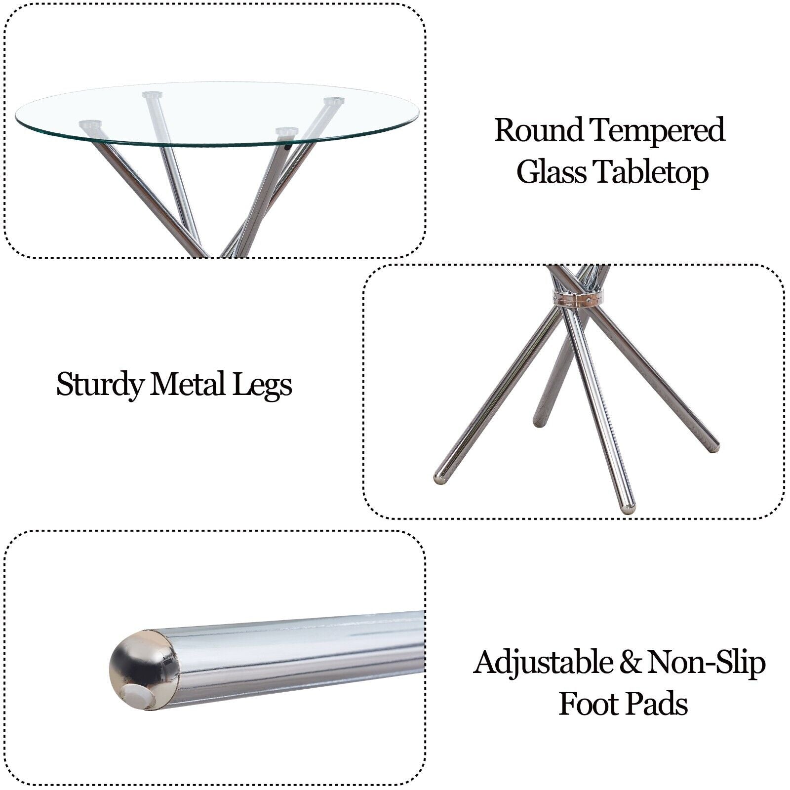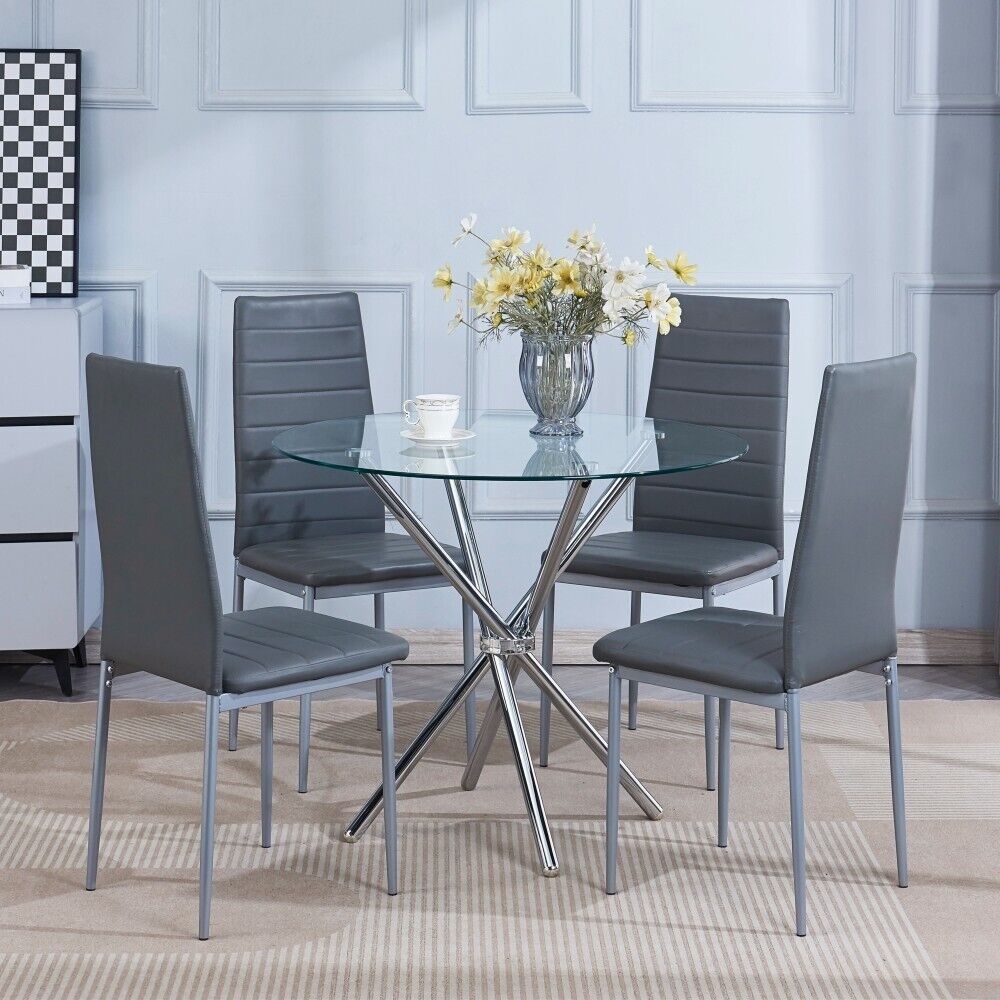 4pcs Grey PU Leather Dining Chairs & Round Clear Glass Dining Table Dining Set