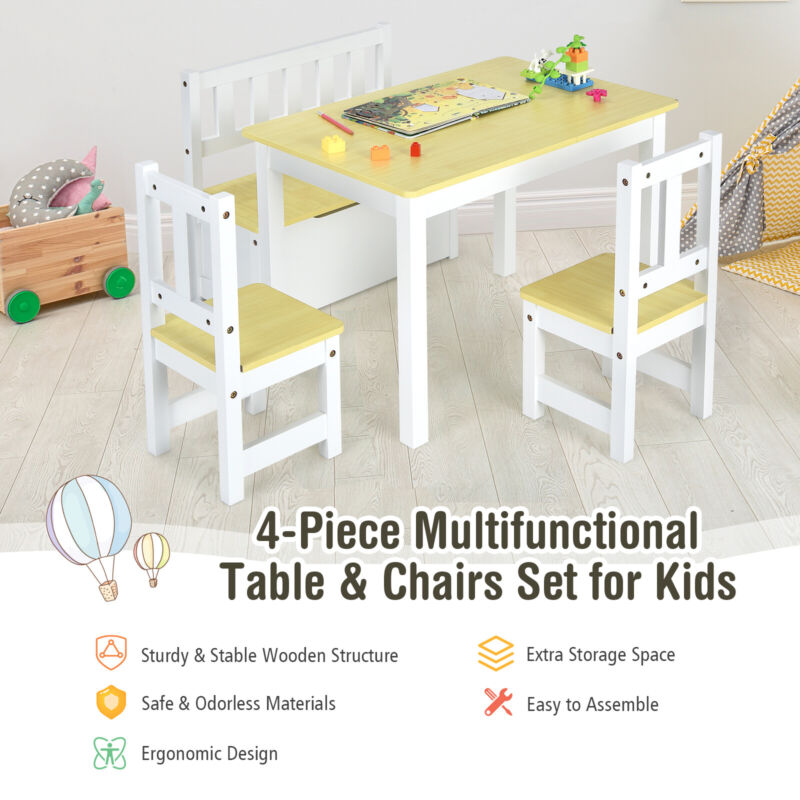 4PCS Kids Table & Chair Set 2-In-1 Wooden Toddler Activity Furniture Storage Box