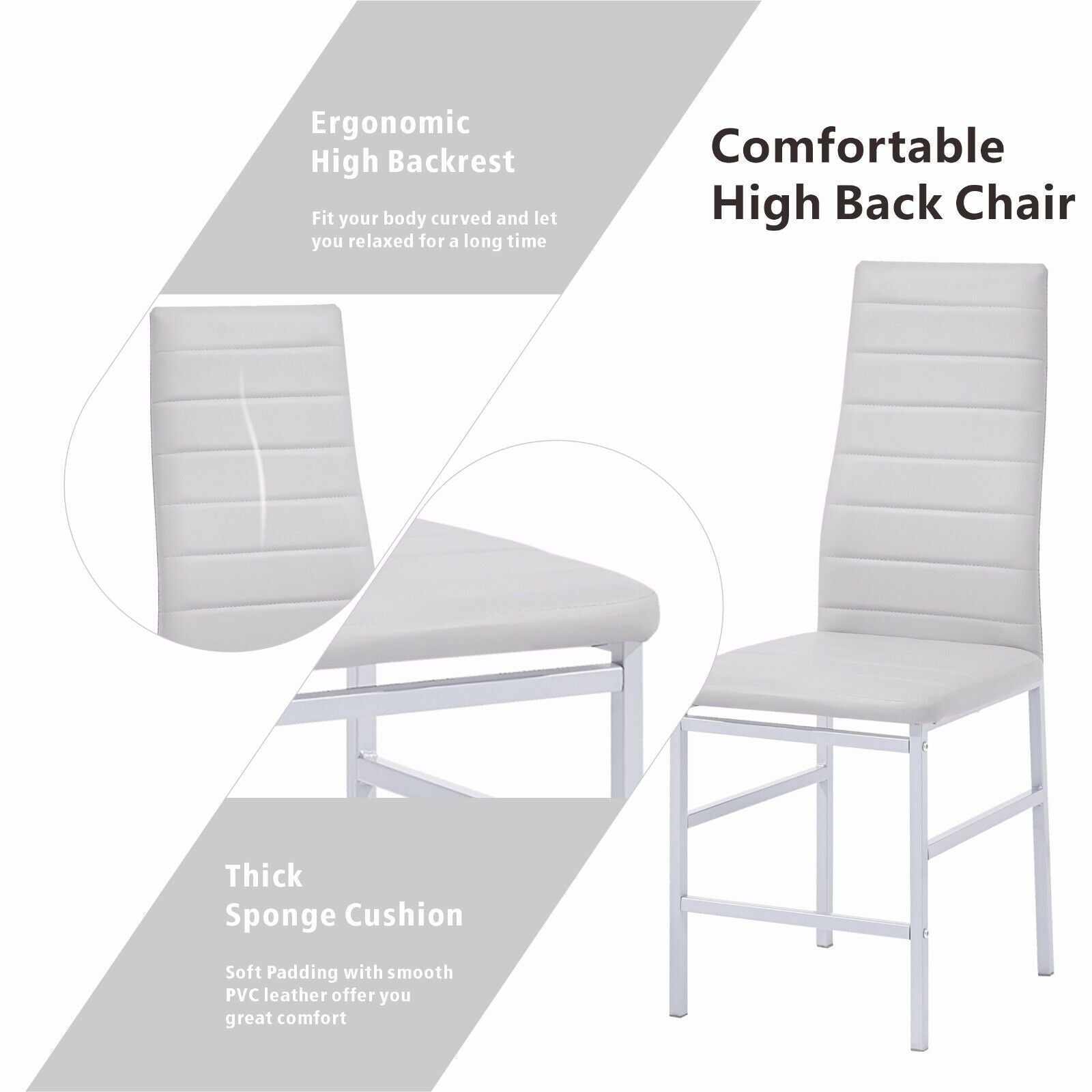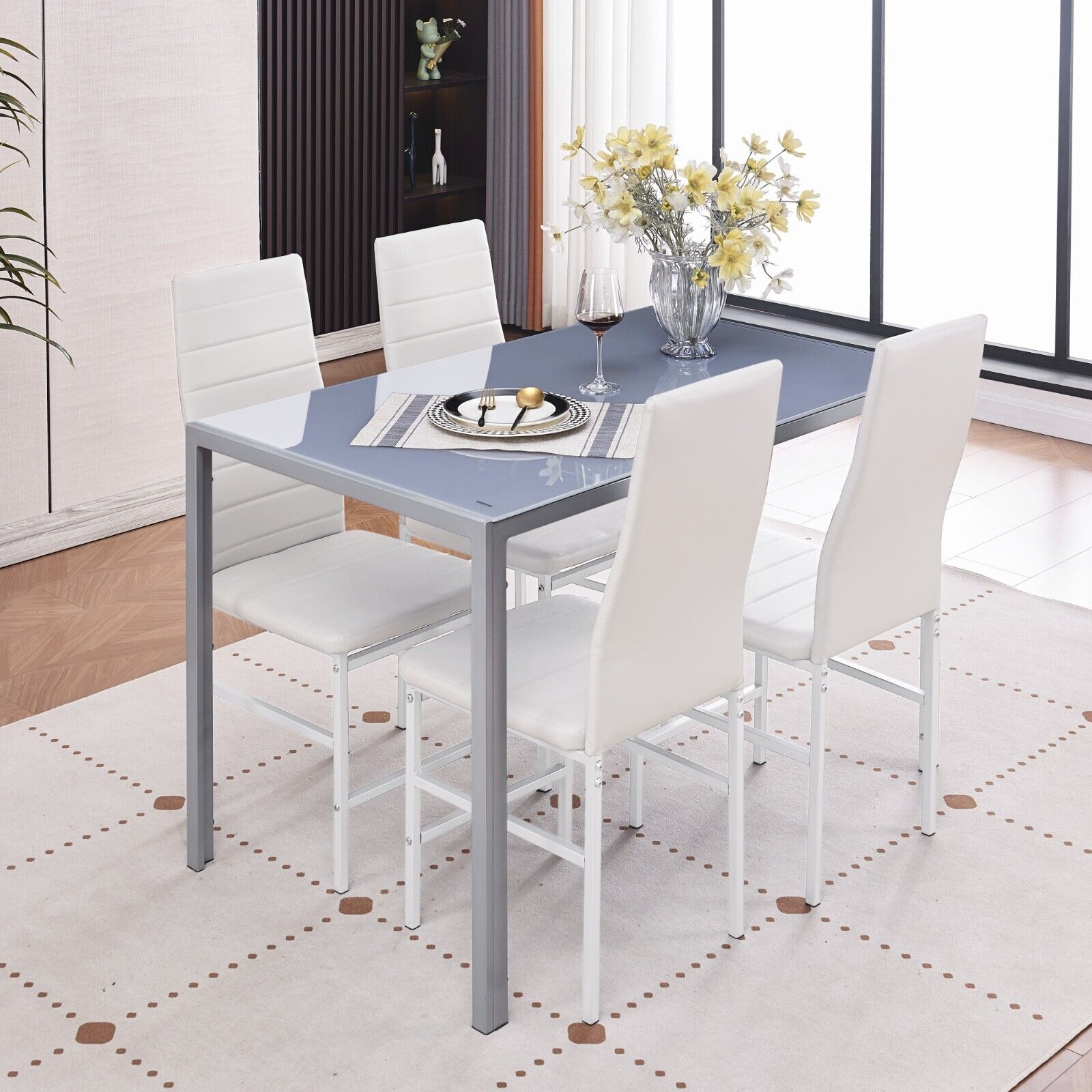 4pcs White Faux Leather Dining Chairs & Grey Tempered Glass Dining Table Set