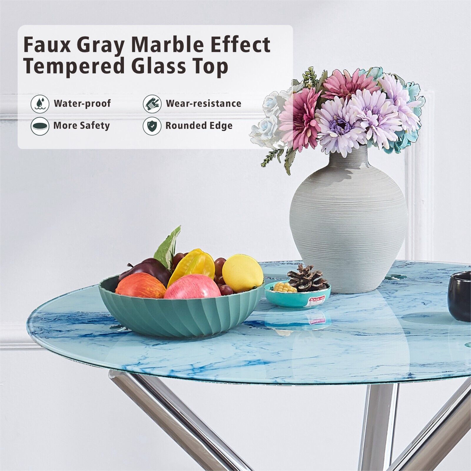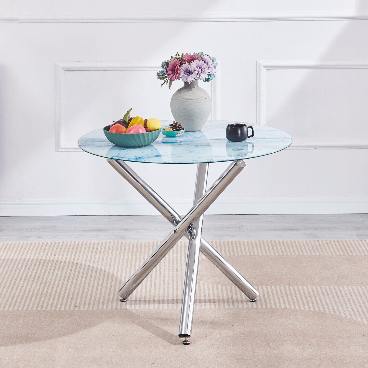 4pcs White Faux Leather Dining Chairs & Round Glass Dining Table Silver Legs Set
