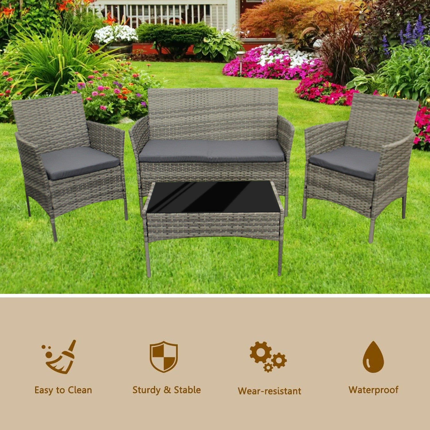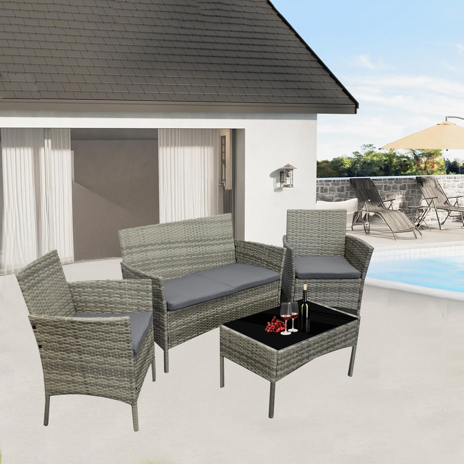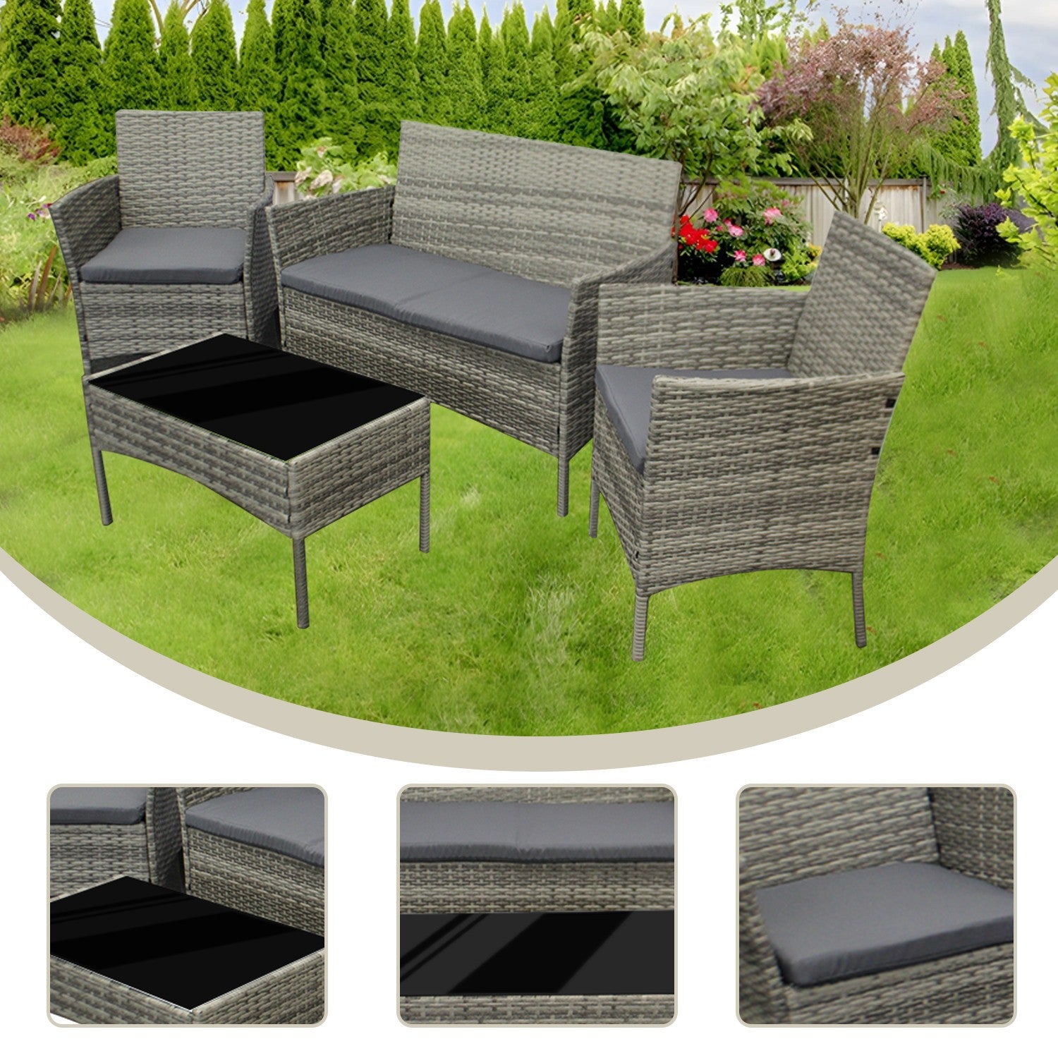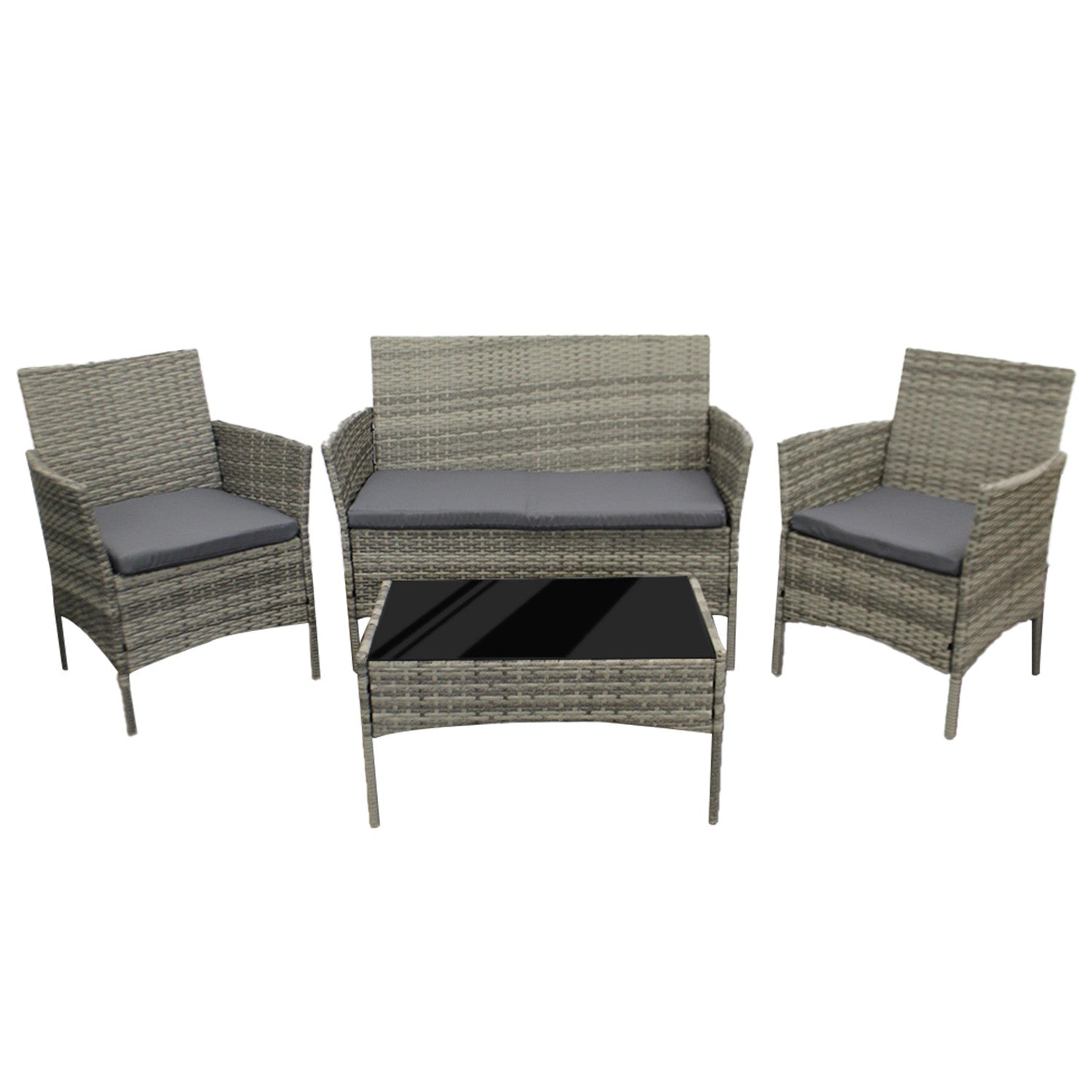 4Piece Rattan Garden Furniture Set Outdoor Lounger Sofa Chair Table Cushion Grey
