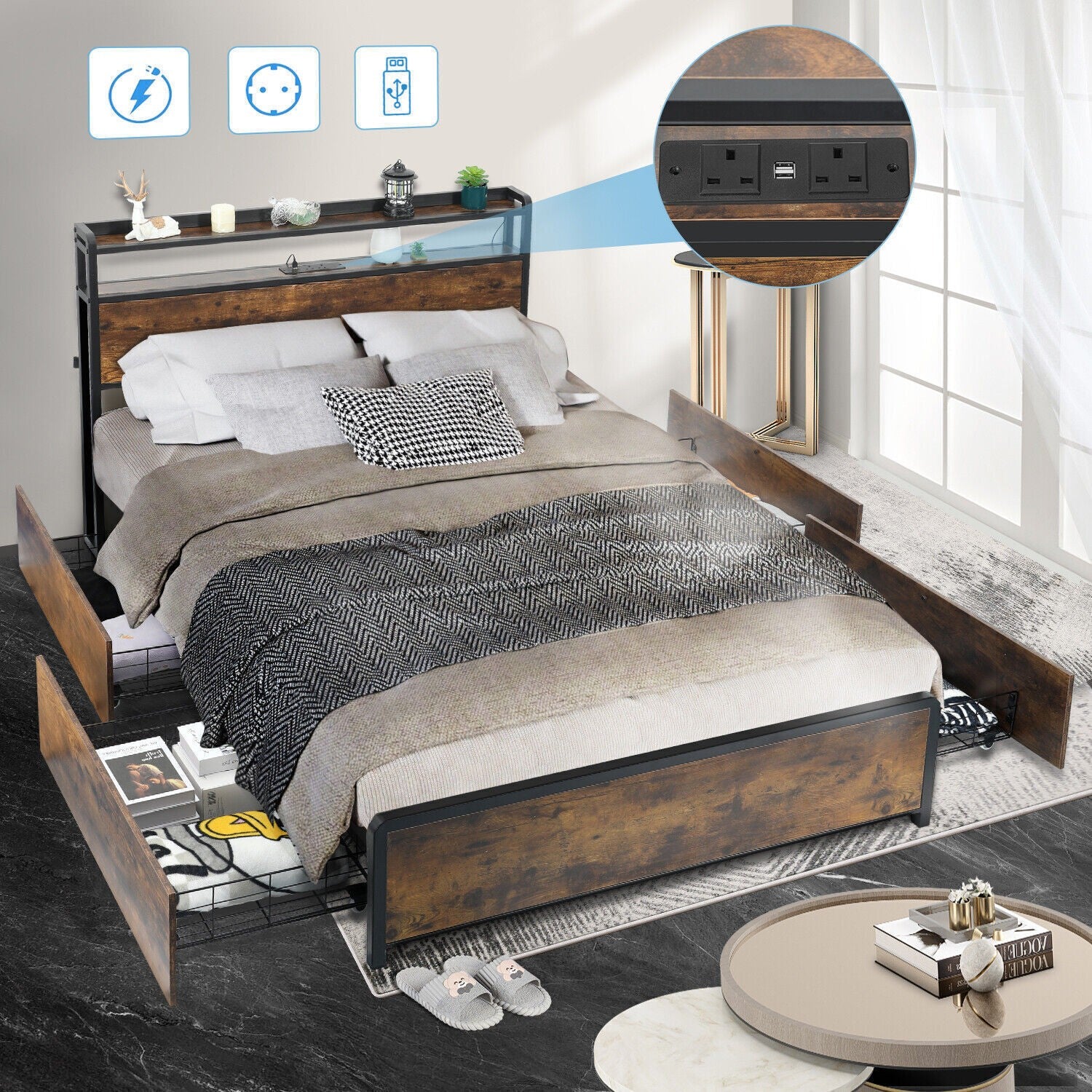 Features Assembly Instructions, Hardware & Tools Included, Slatted Foundation, Metal Frame, RGB Ambient Light, 2 UK Socket, 4 Storage Drawer, 4ft6