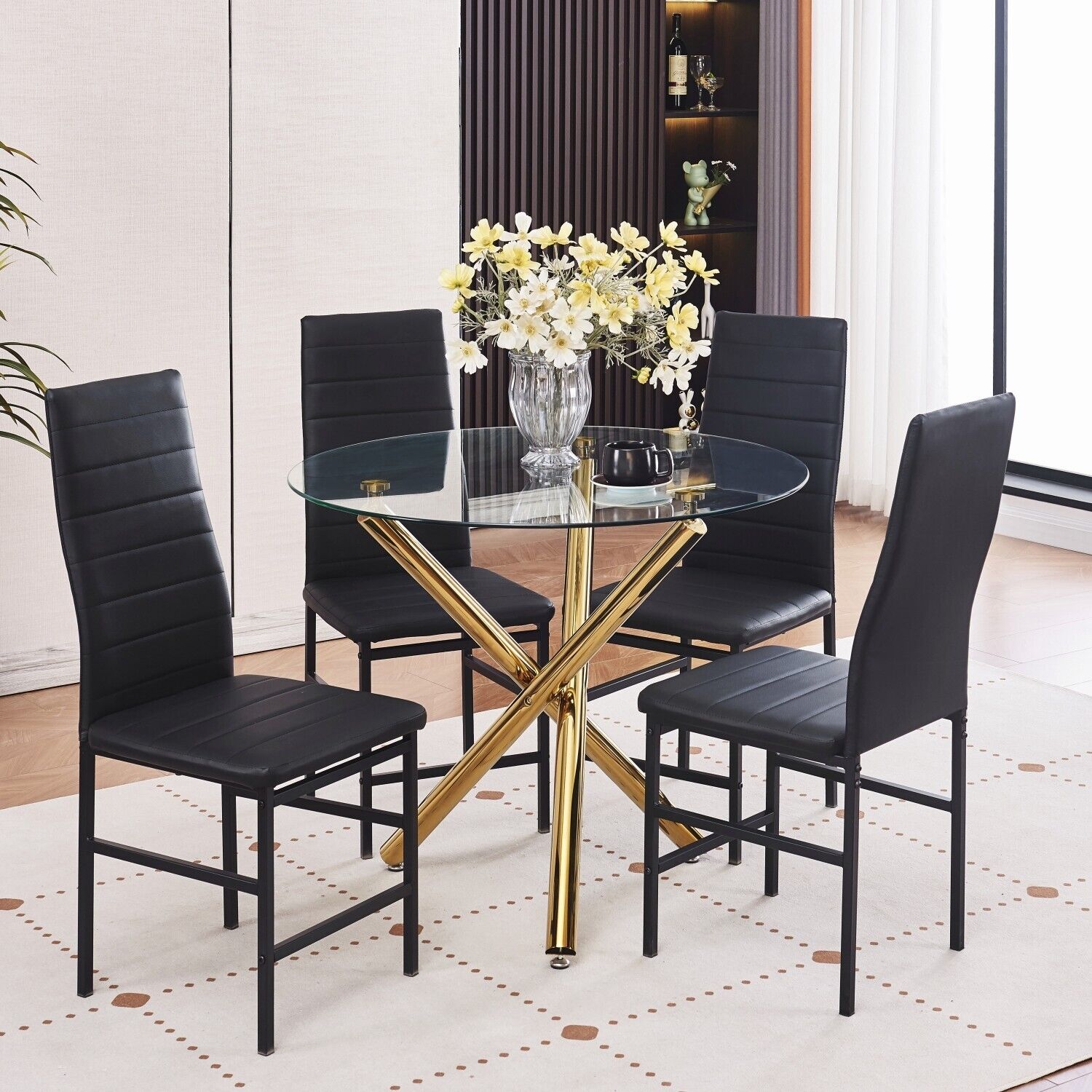 4x Black Faux Leather Dining Chairs & Round Clear Glass Dining Table Golden Legs