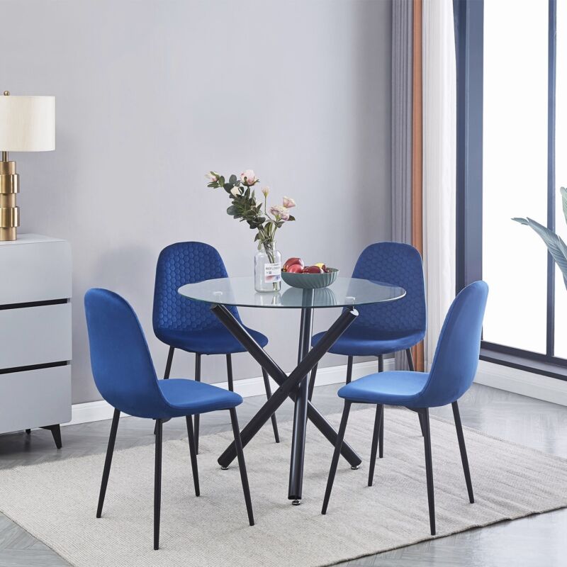 4x Blue Velvet Designed Dining Chairs Black Metal Legs Kitchen Dining Room Chair
