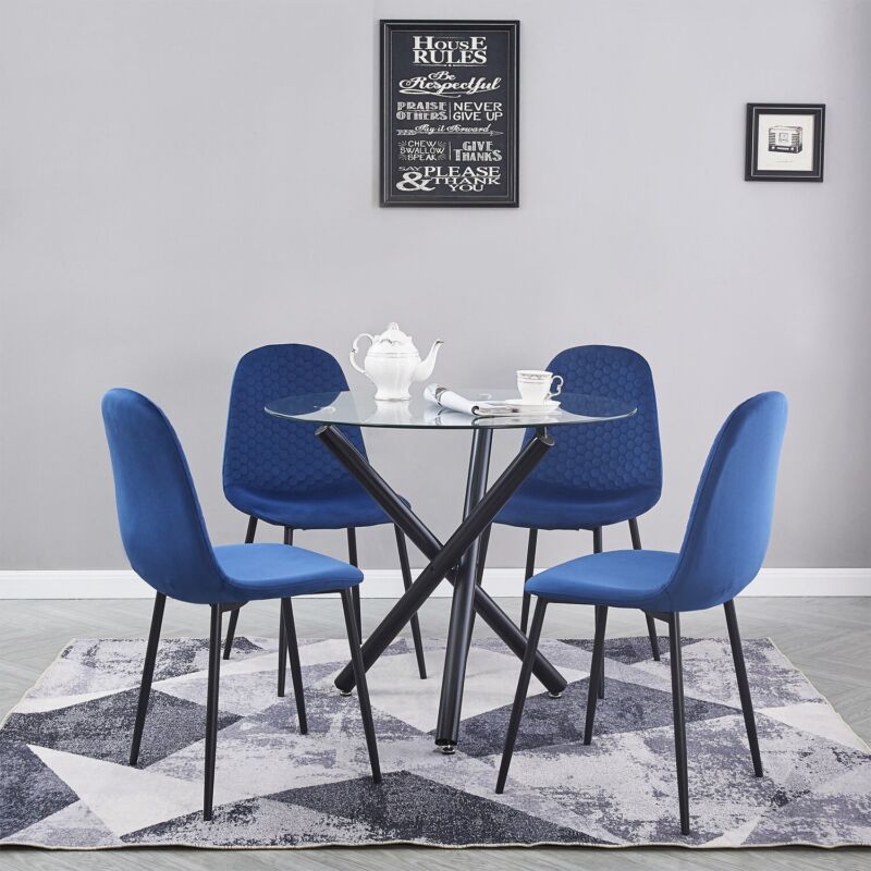 4x Blue Velvet Dining Chairs Round Glass Dining Table Black Metal Leg Dining Set