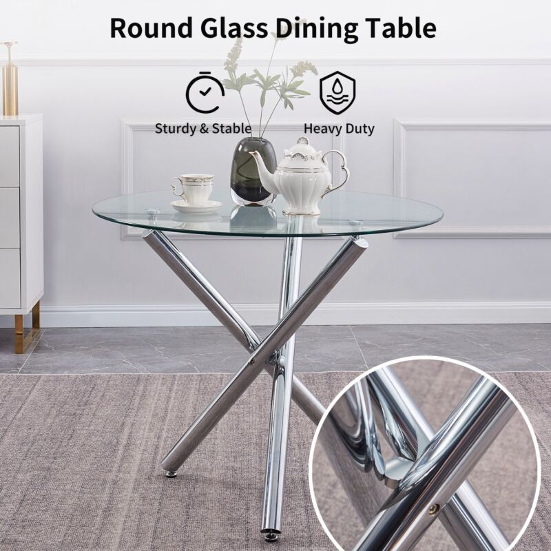 4x Blue Velvet Dining Chairs Round Glass Dining Table Silver Legs Dining Set