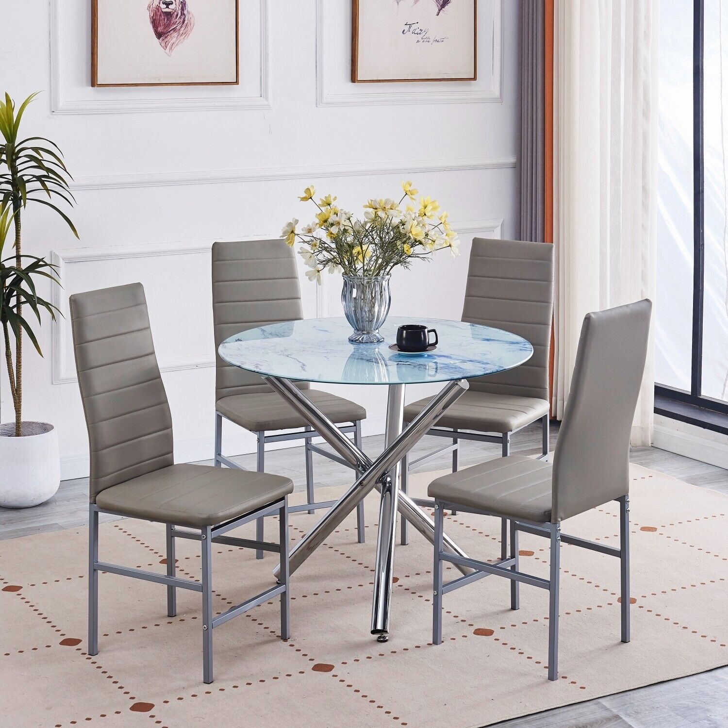 4x Grey Faux Leather Dining Chairs & Round Marble Glass Dining Table Silver Legs