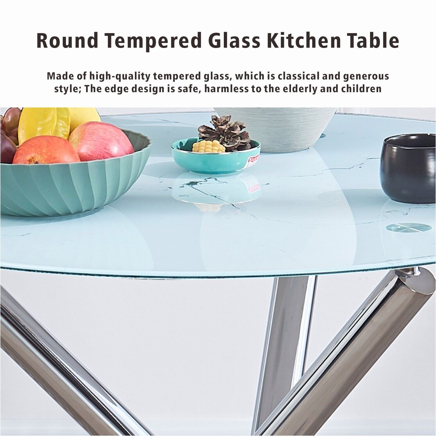 4x White Faux Leather Dining Chairs&Round Marble Glass Dining Table Silver Legs