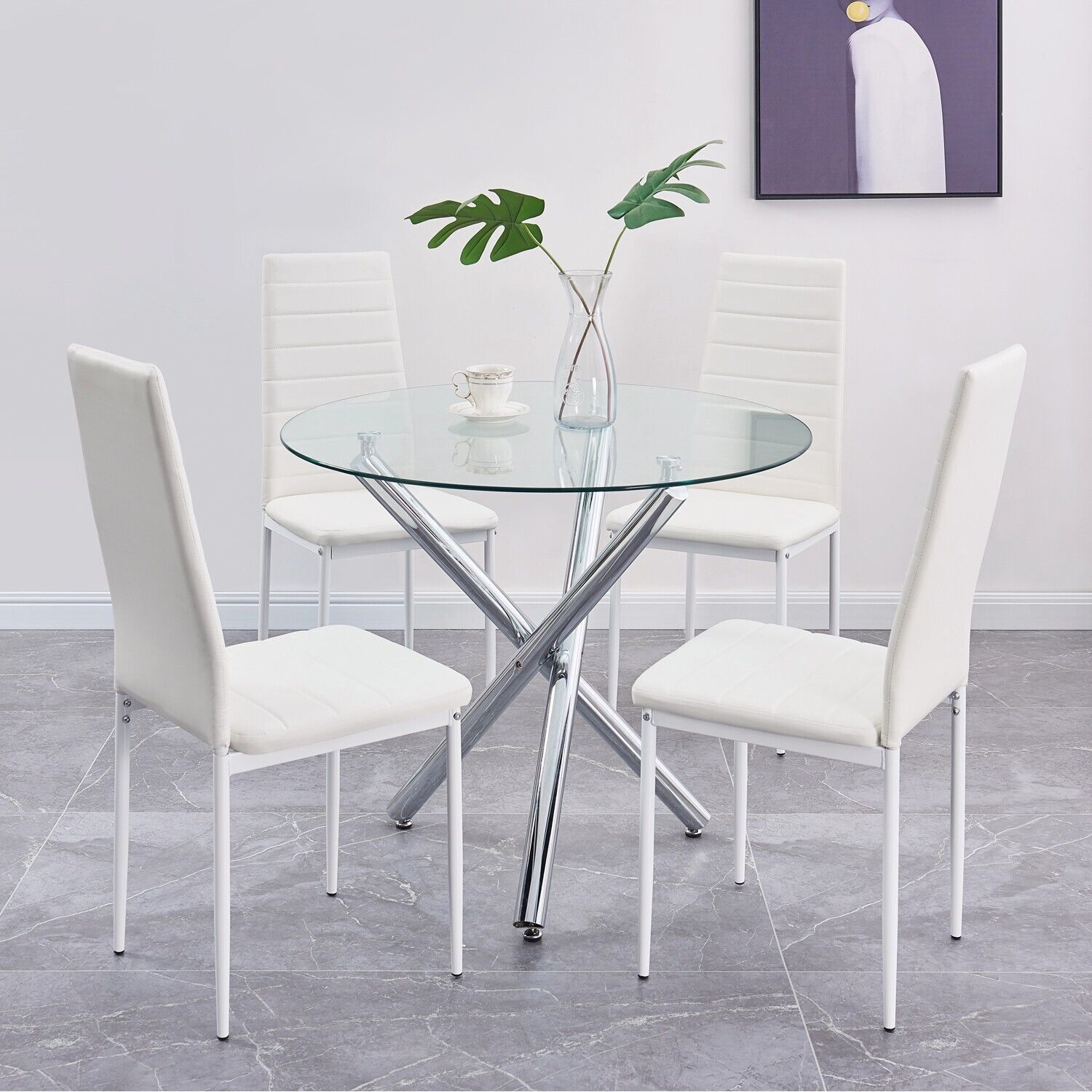 4x White Faux Leather Dining Chairs Round Tempered Glass Silver Leg Dining Table
