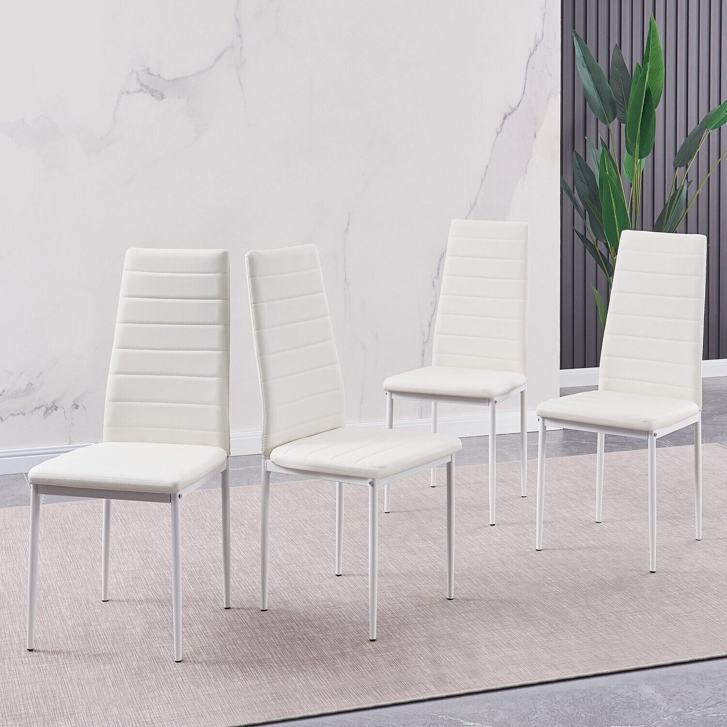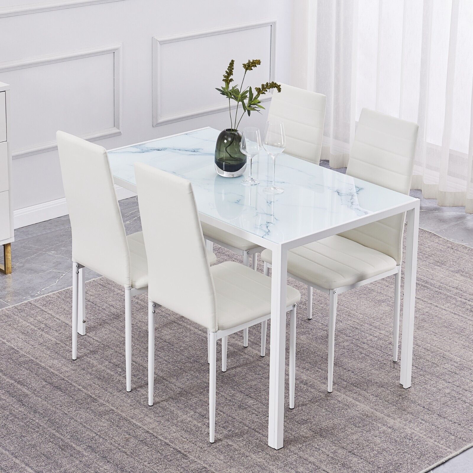 4x White Faux Leather Dining Chairs & White Marble Glass Dining Table Dining Set