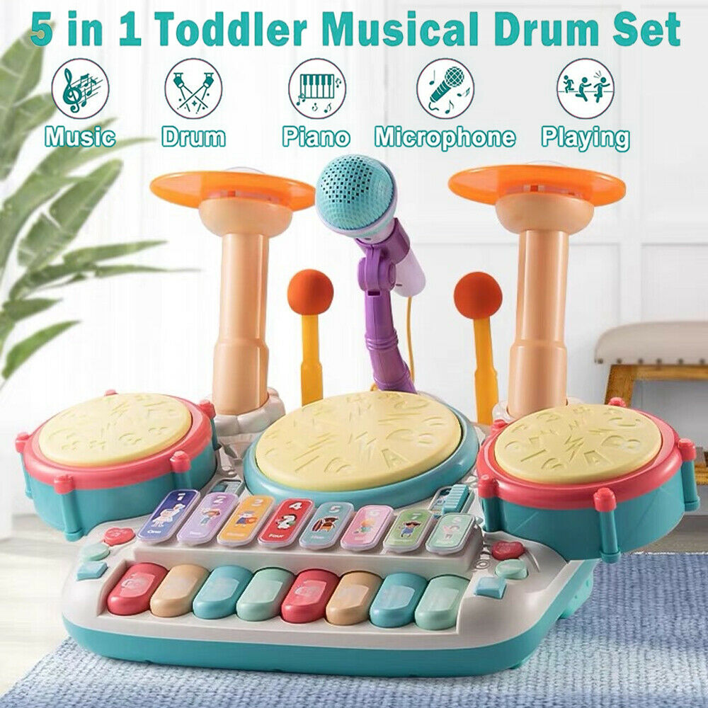 5 In 1 Kids Toddler Drum Set w/Microphone Piano Set Kids Musical Instrument Toy