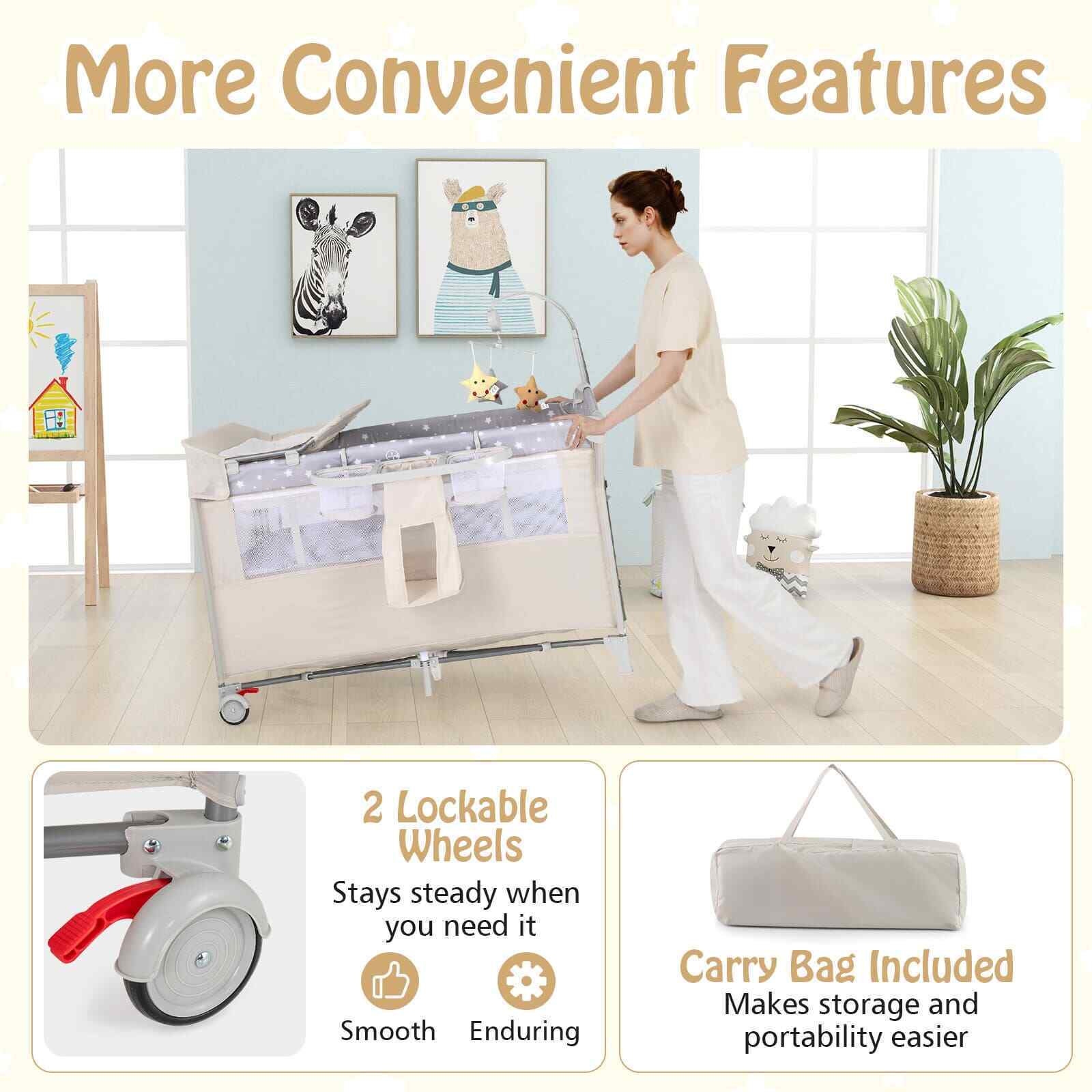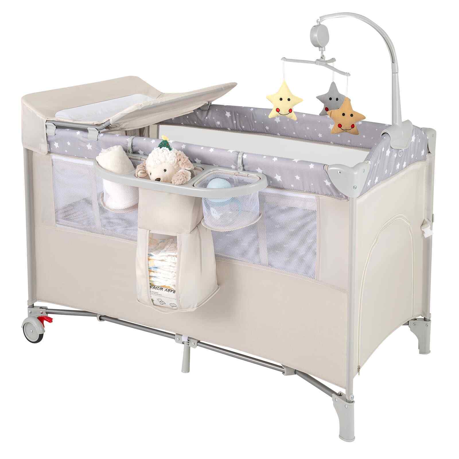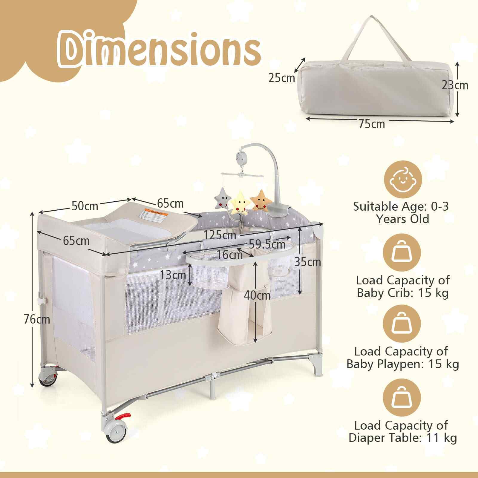5 in 1 Travel Cot Folding Baby Playard with Storage Rack and Carry Bag Beige