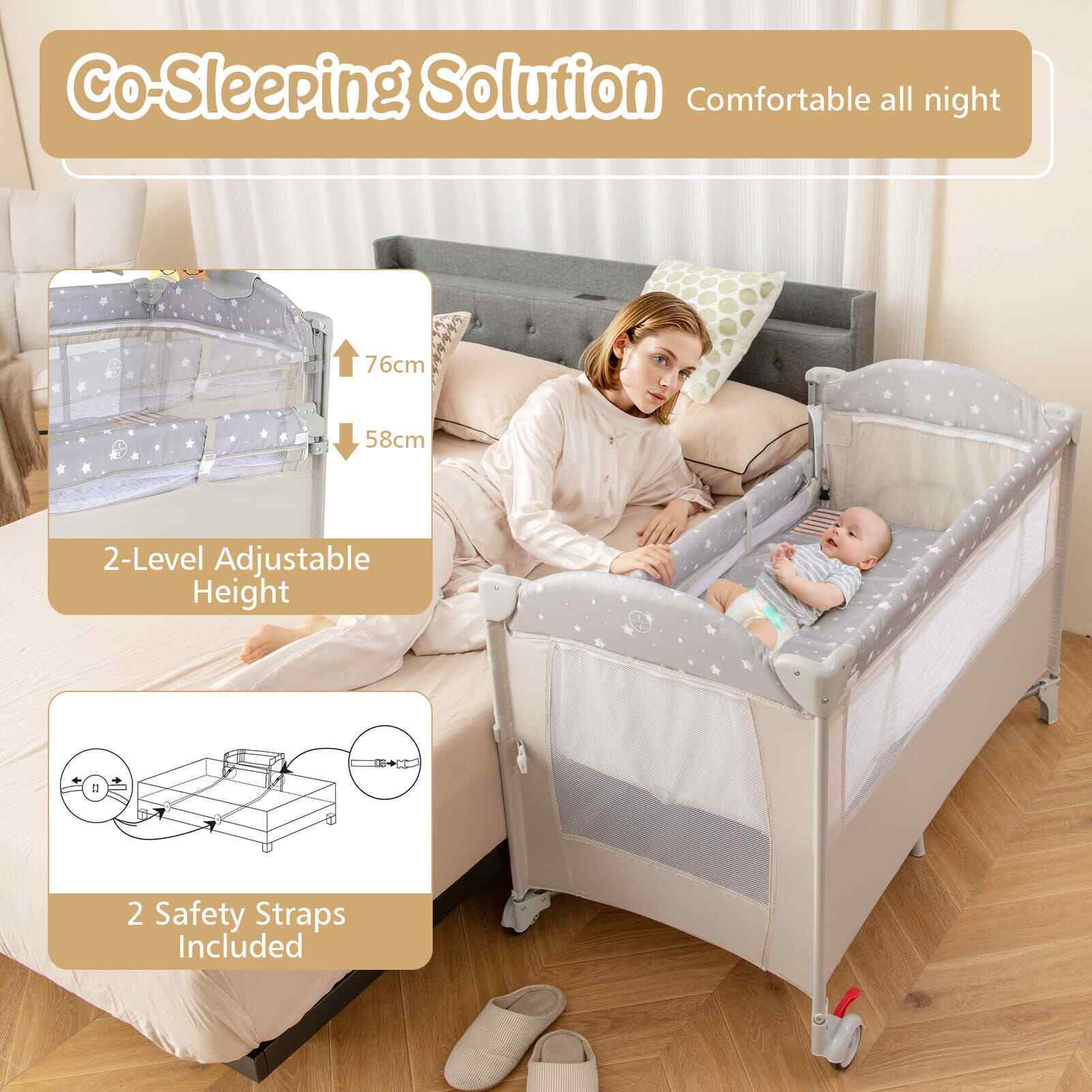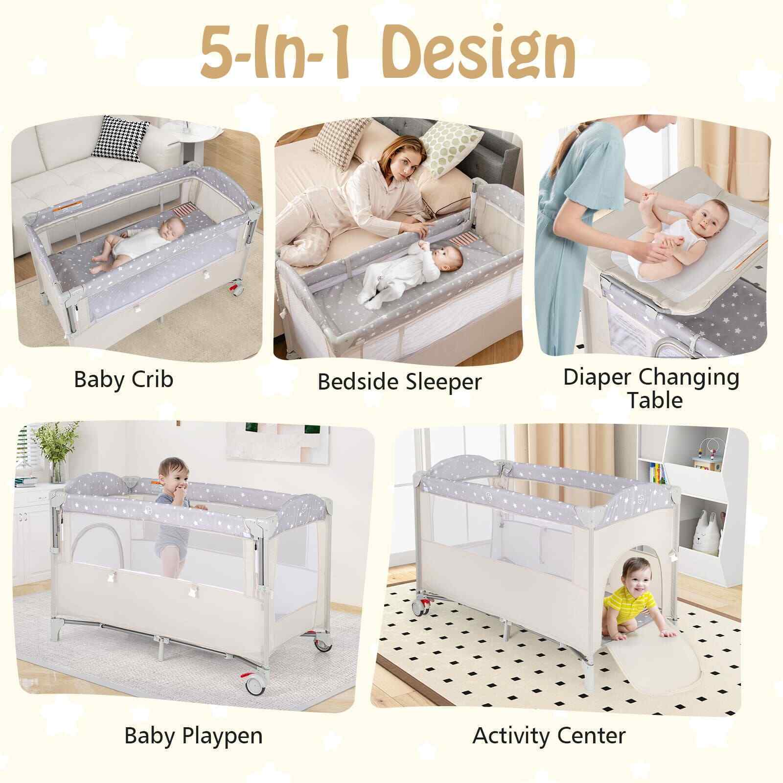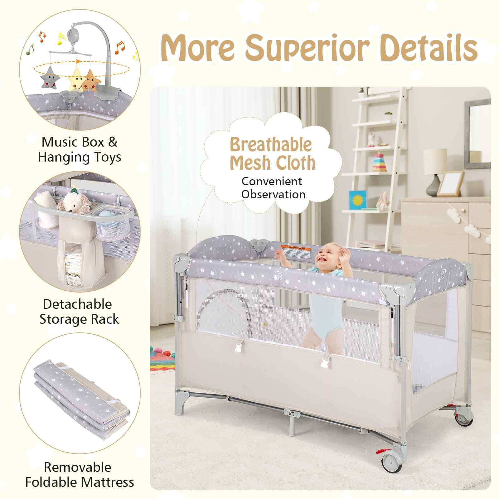 5 in 1 Travel Cot Folding Baby Playard with Storage Rack and Carry Bag Beige