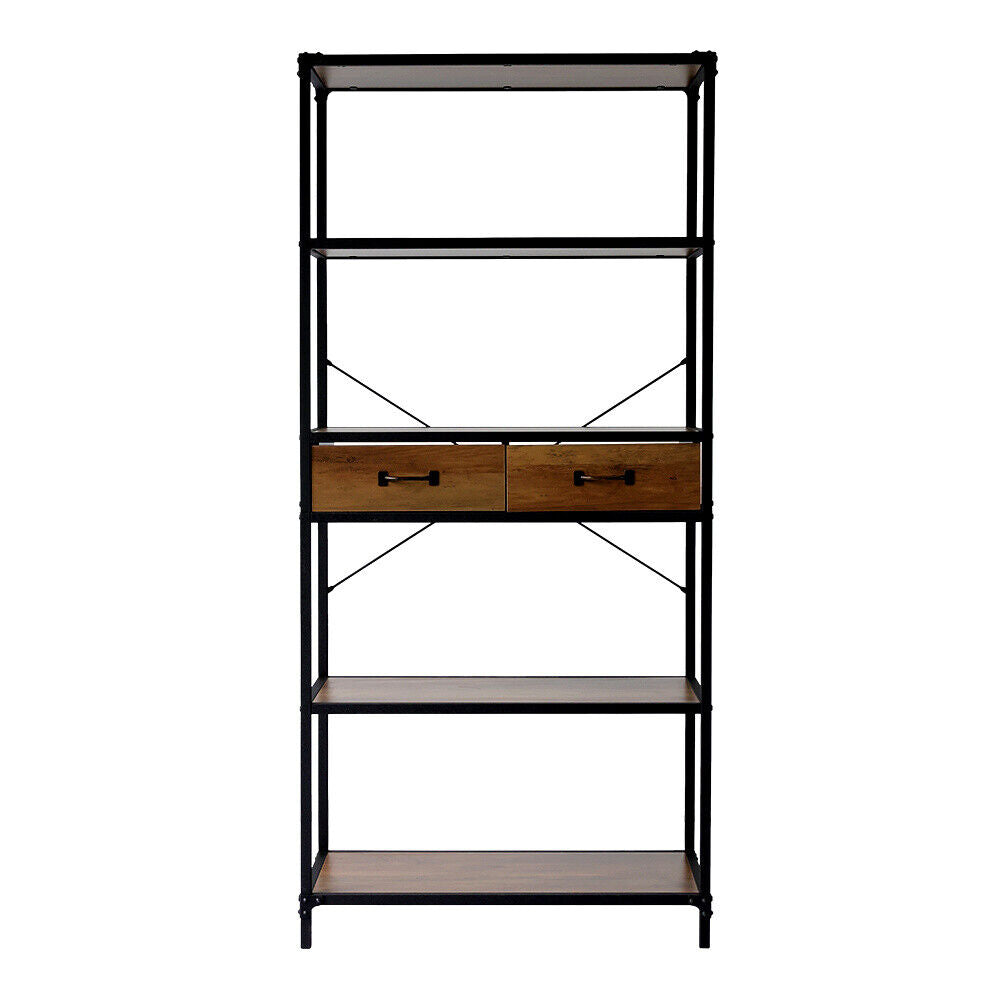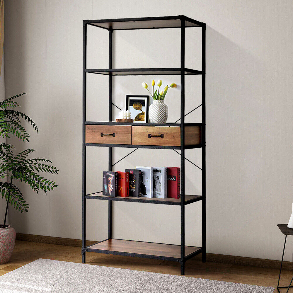 5-Tier Bookshelf Bookcase Metal Frame Shelf Industrial Shelving Unit w/2 Drawers