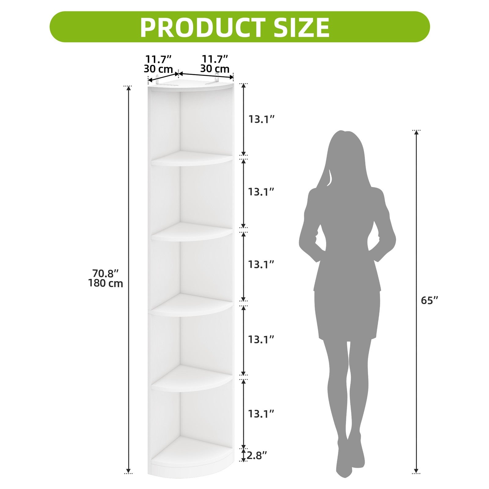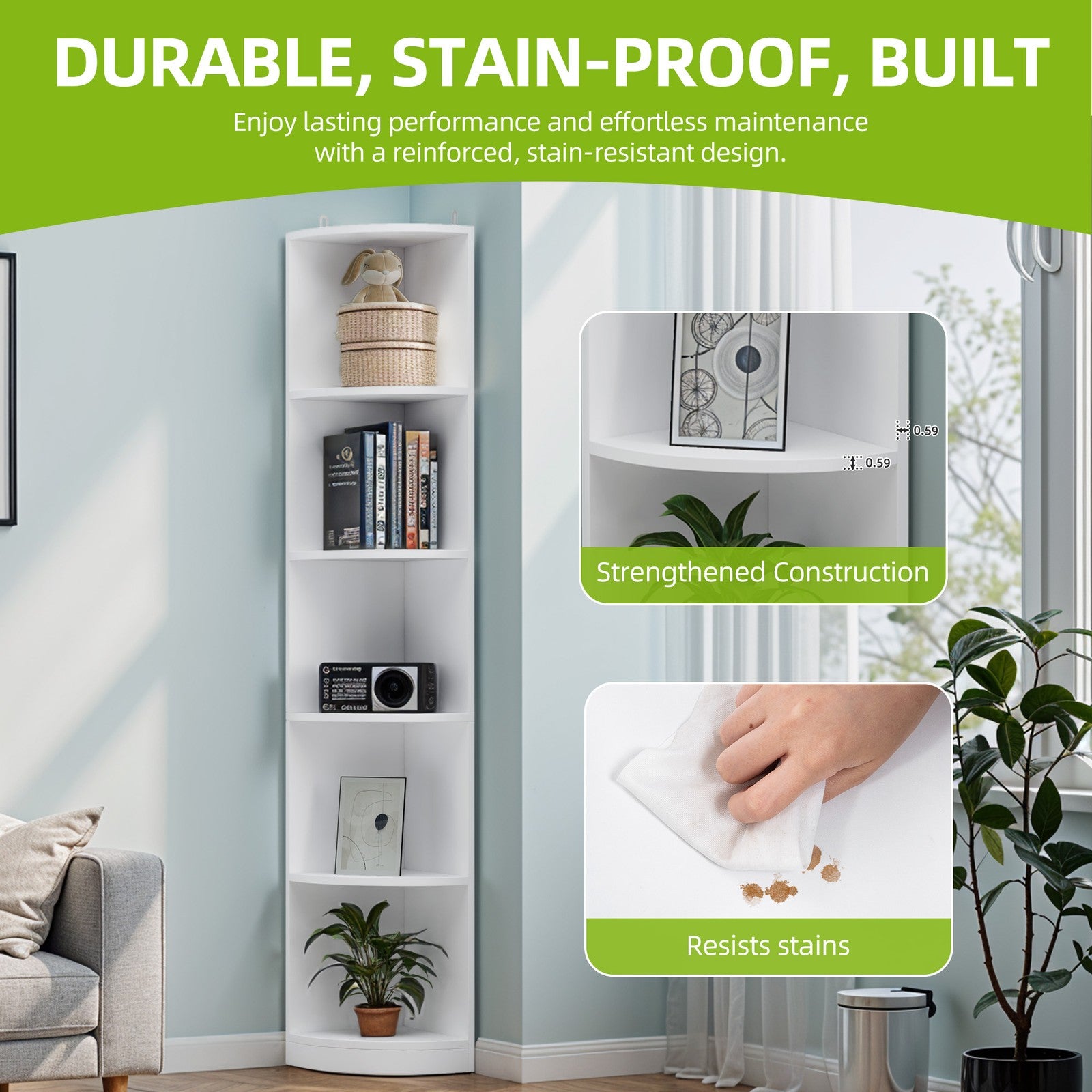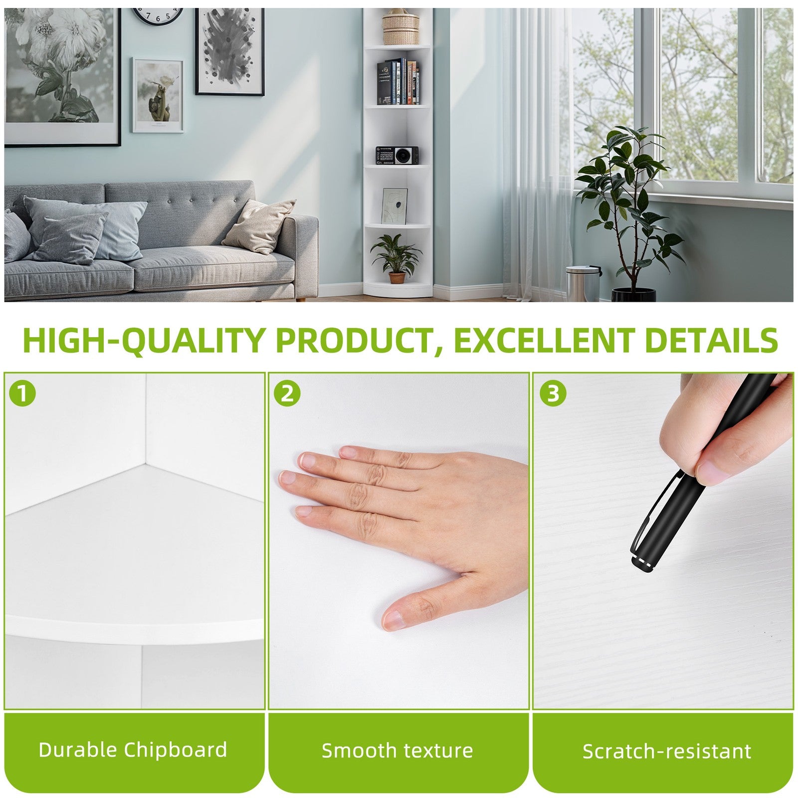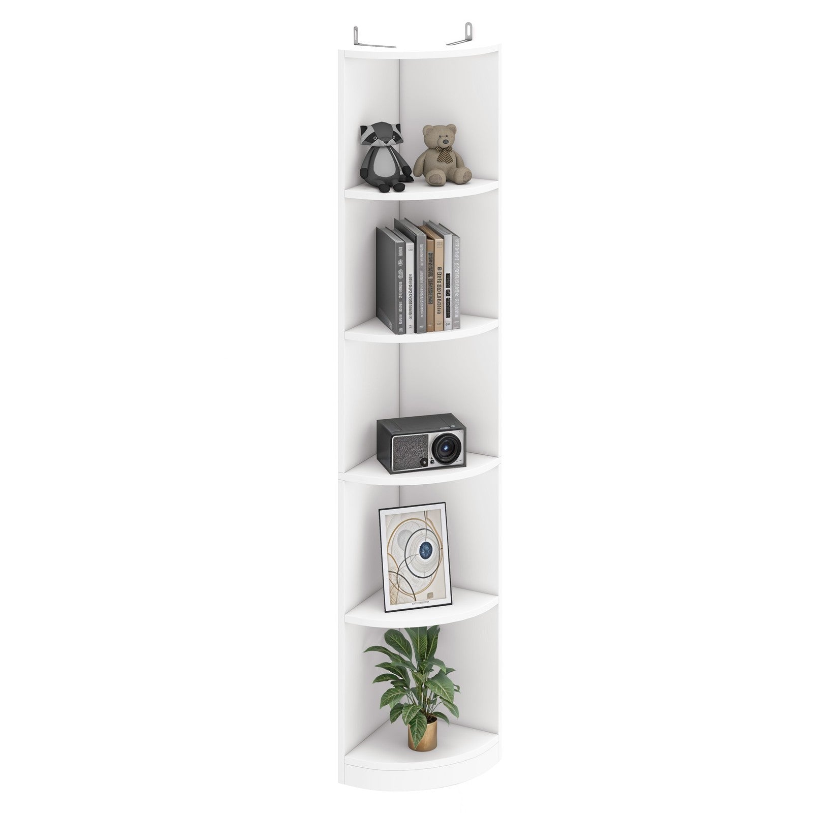 5-Tier Corner Bookshelf, White Freestanding Display Unit, 180cm Tall