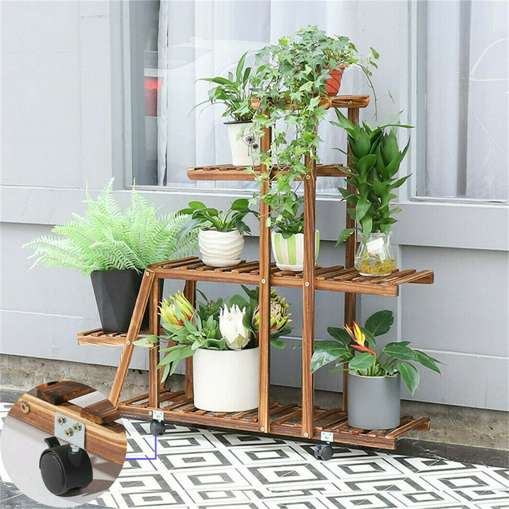 5 Tier Pine Wood Ladder Plant Stand Flower Planter Rack with 4 Lockable Wheels O