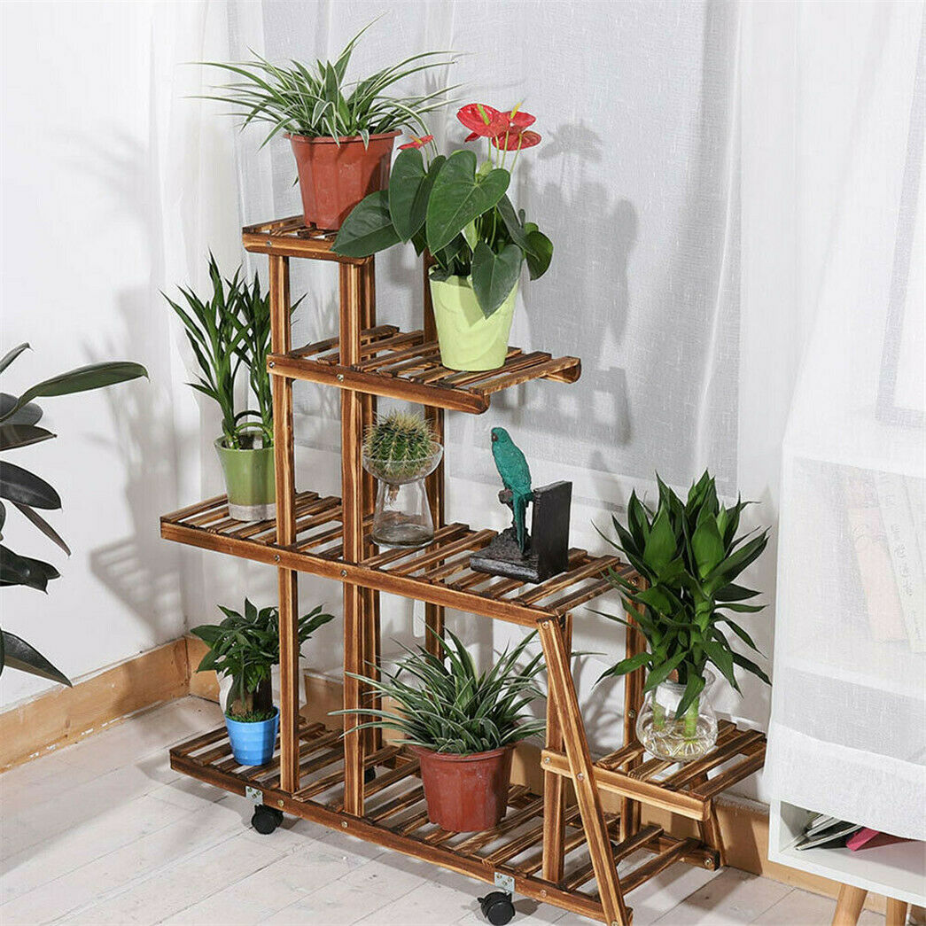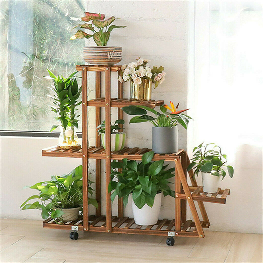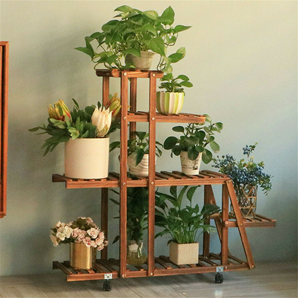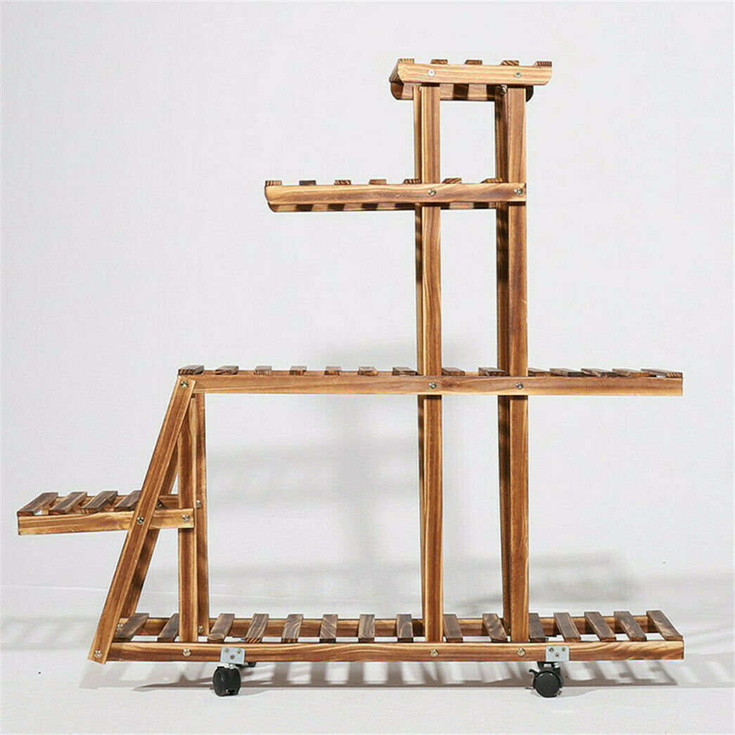 5 Tier Pine Wood Ladder Plant Stand Flower Planter Rack with 4 Lockable Wheels O