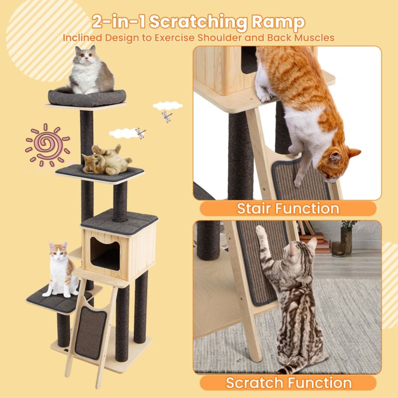 5-Tier Wooden Cat Tower Tall Cat Tower w/ Scratching Sisal Posts and Top Perch