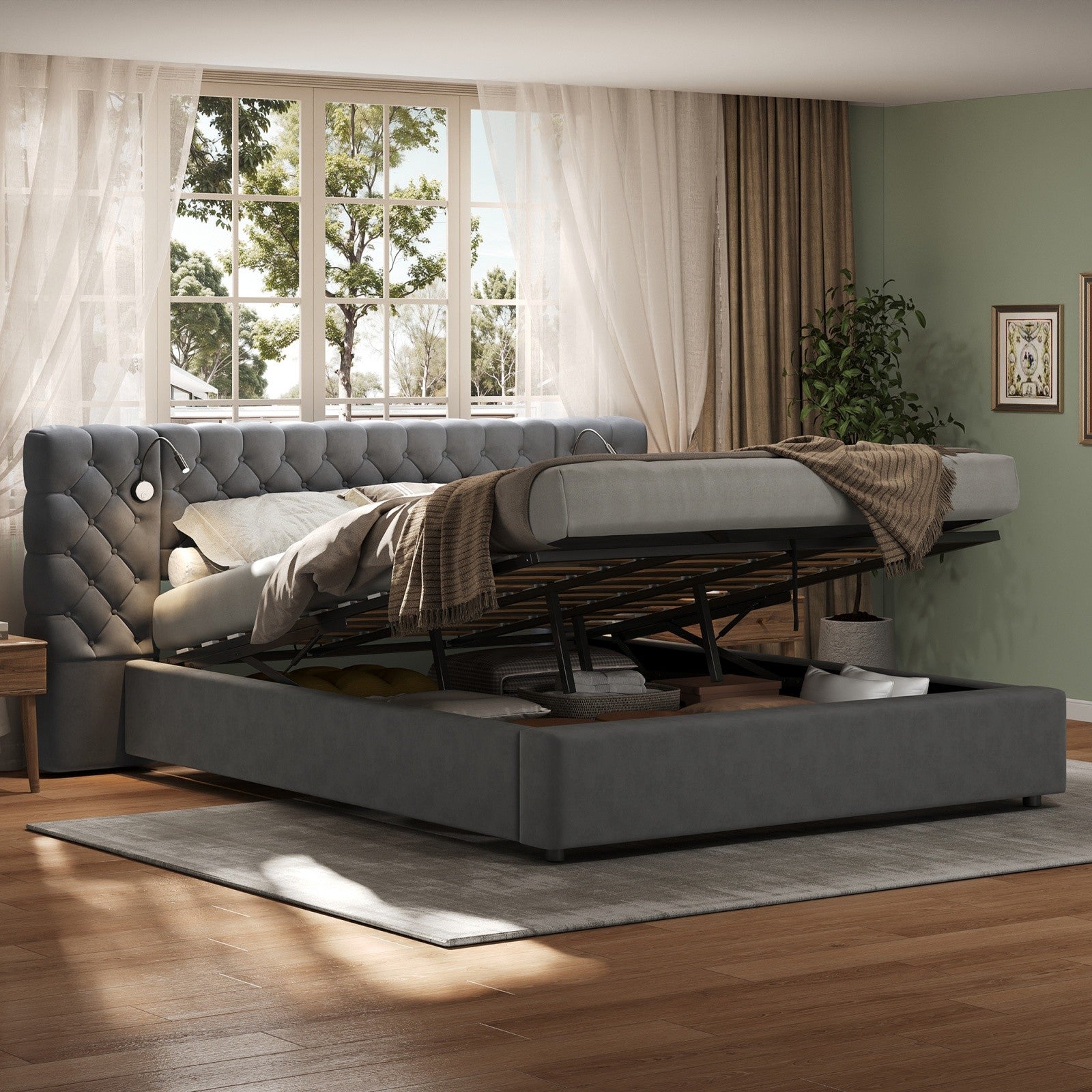 5ft King Size Bed Frame with Wide Headboard & LED, Hydraulic Ottoman Storage Bed