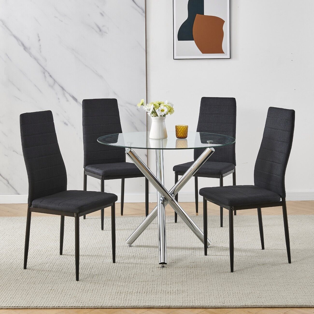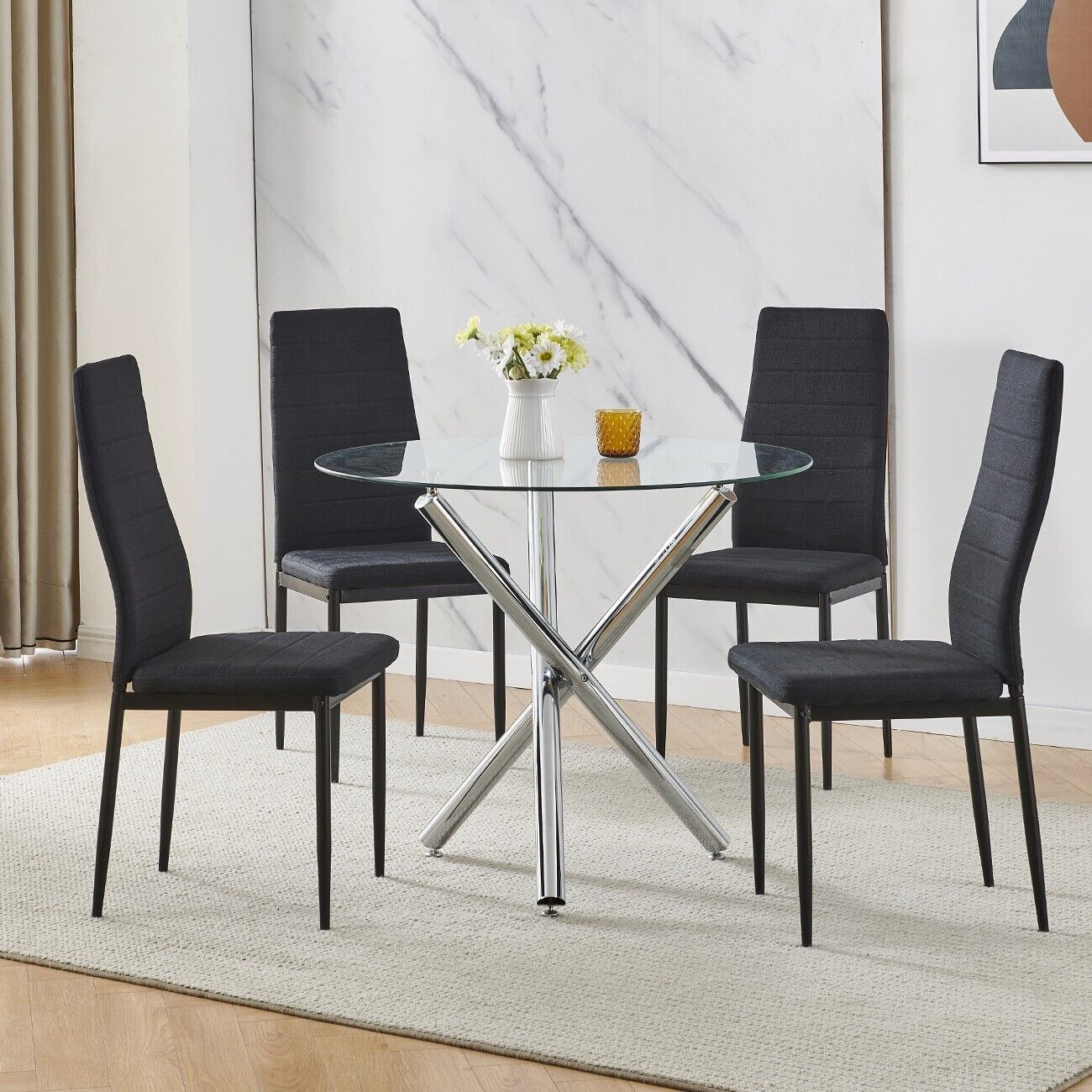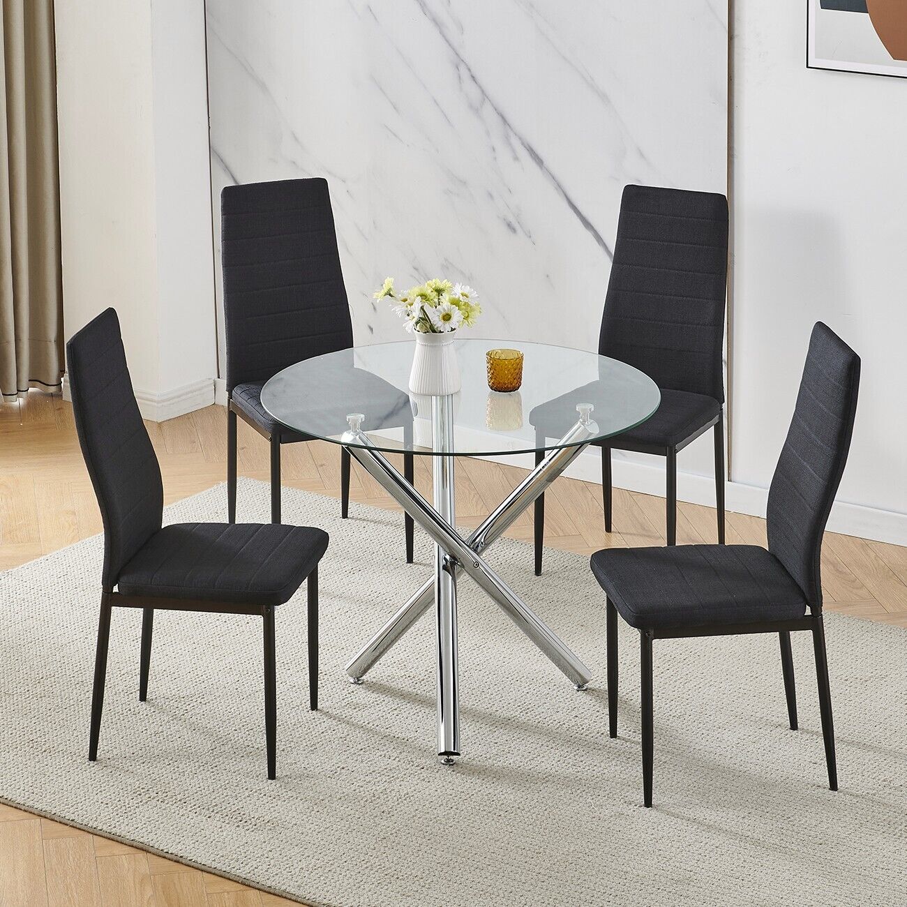 5Pcs Round Dining Table Set Glass Dining Table+ 4 Black Linen Dining Chairs Set