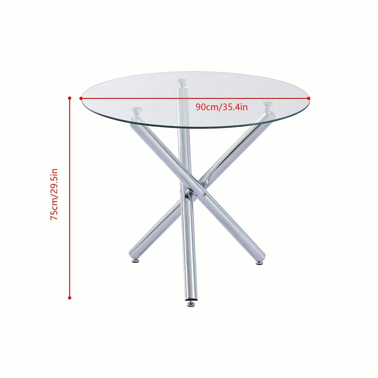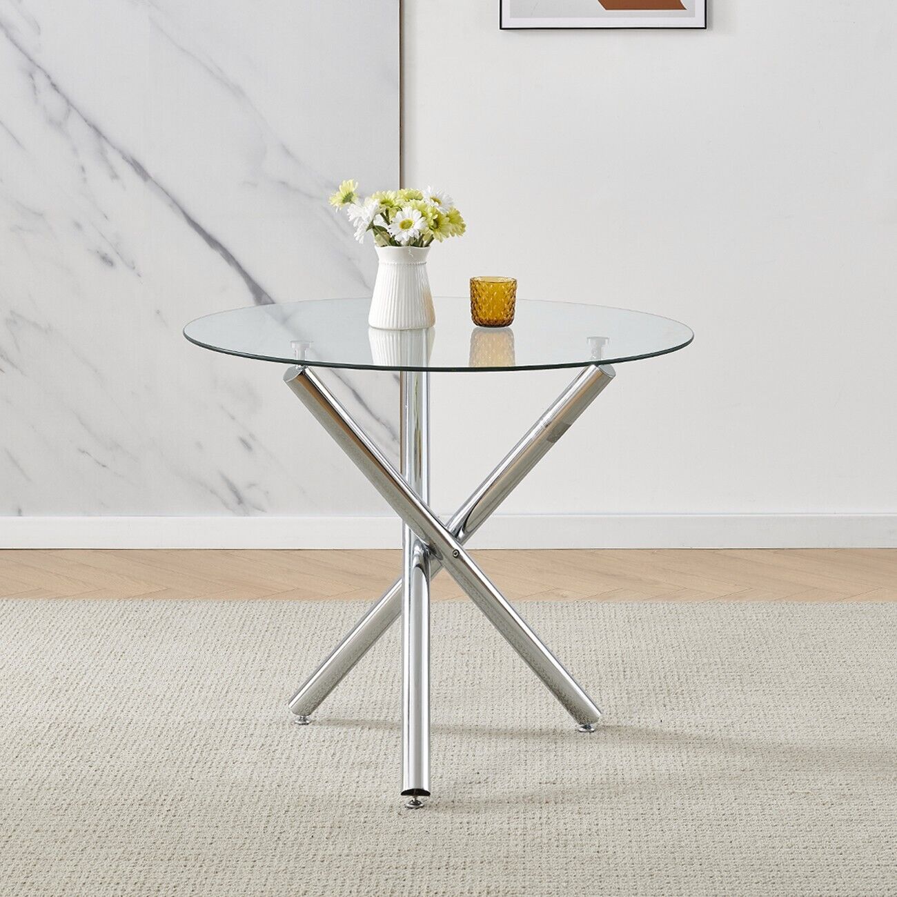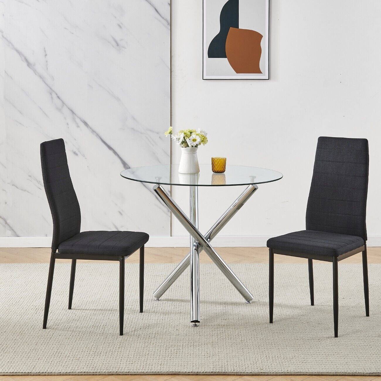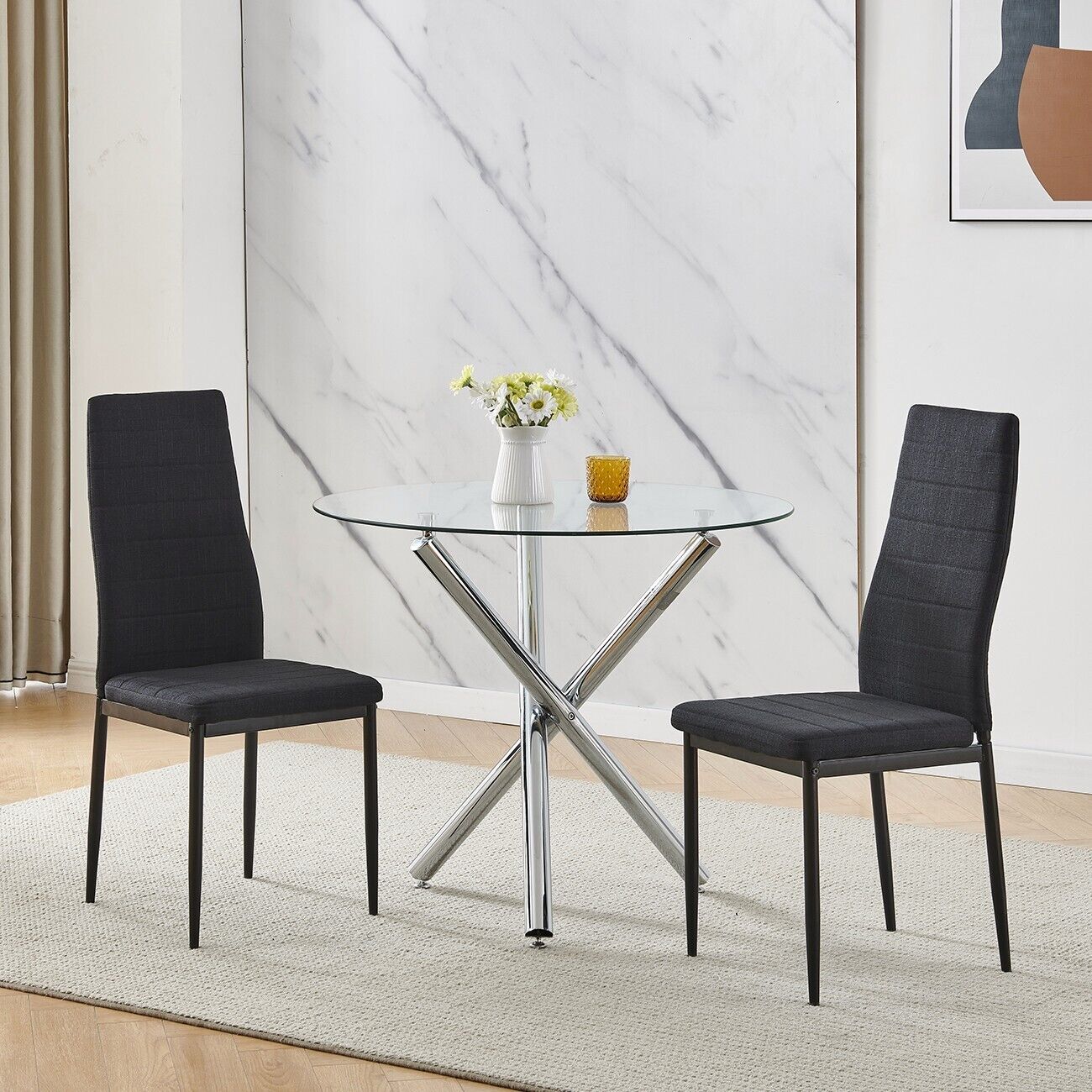 5Pcs Round Dining Table Set Glass Dining Table+ 4 Black Linen Dining Chairs Set