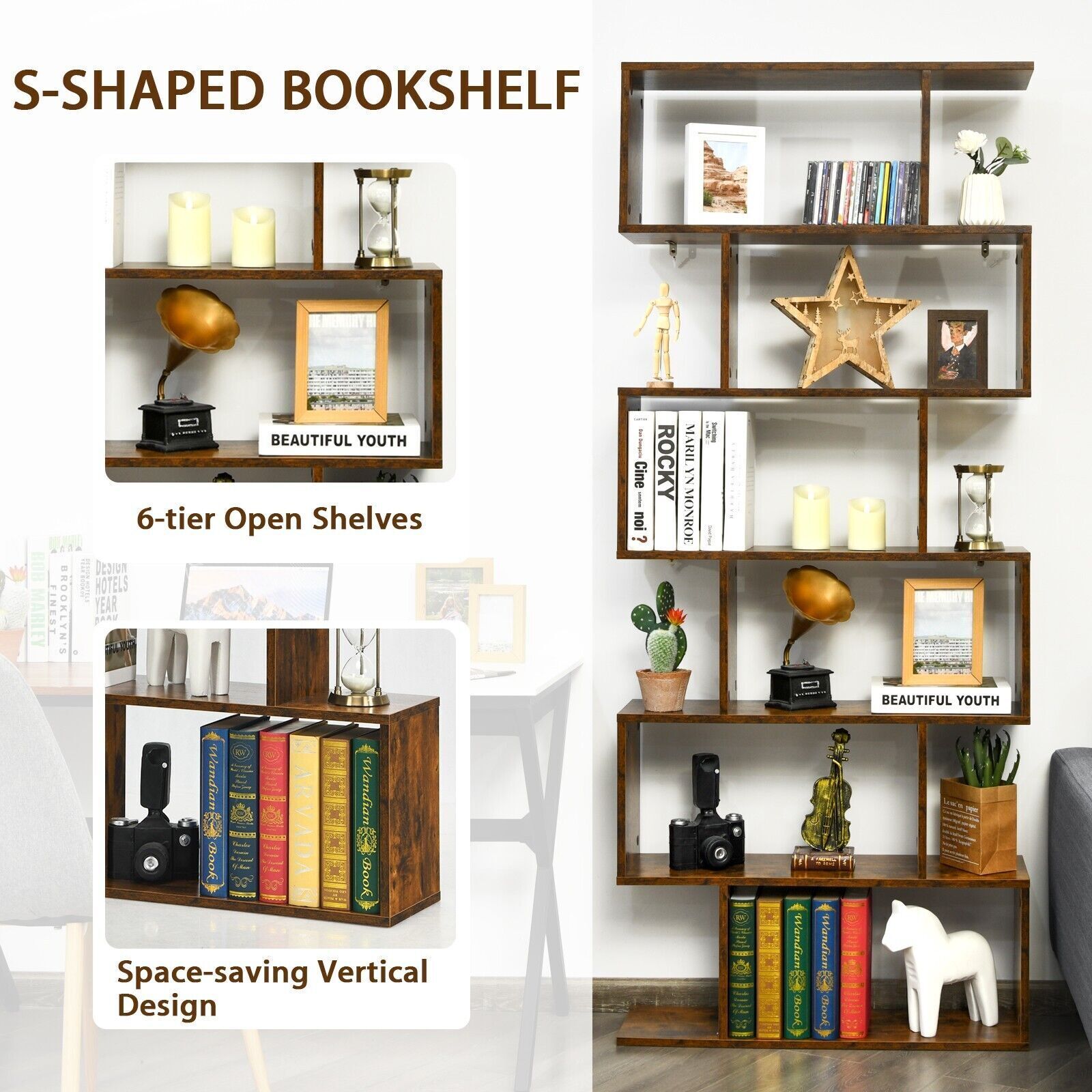6-tier Bookcase Industrial S-Shaped Bookshelf Wooden Storage Display Rack