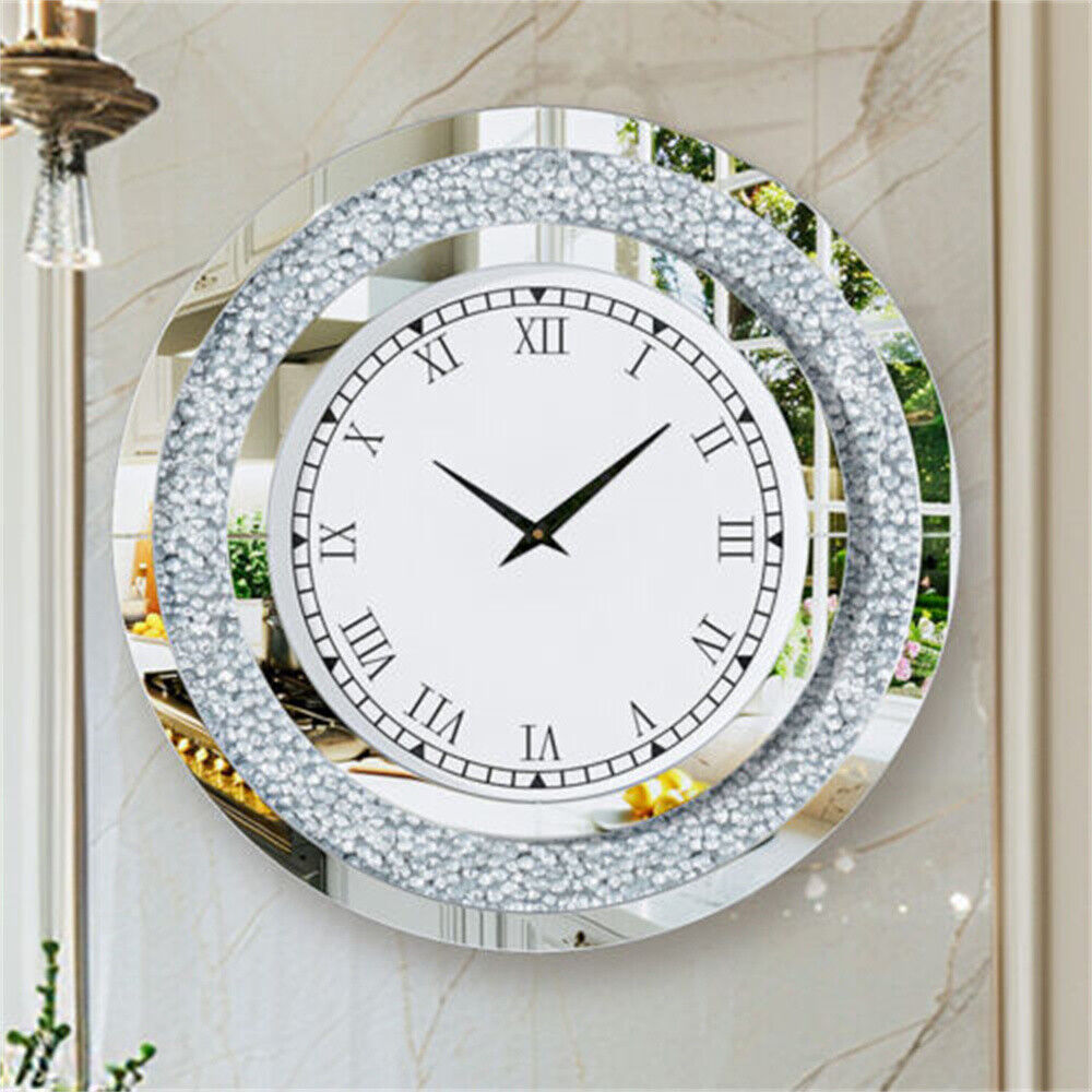 60cm Bling Silver Round Wall Clock Sparkle Twinkle Shining Mirrored Wall Clock