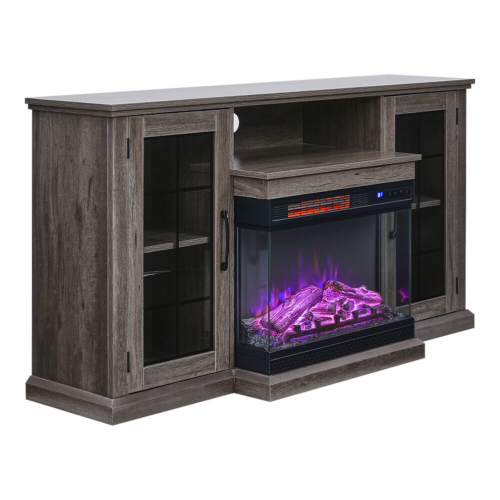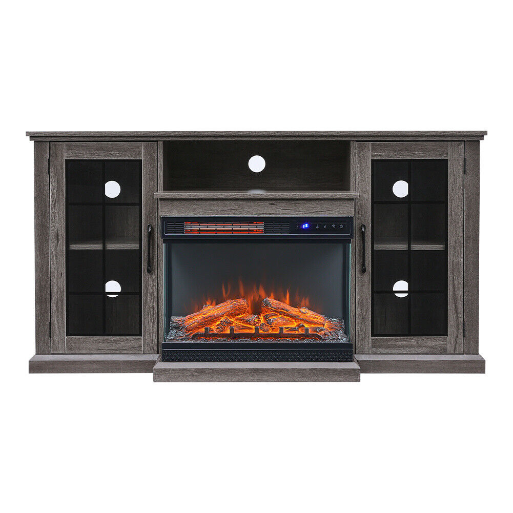 60in Grey Living Room TV Stand w/ Electric Fireplace Fire Log Stove Unit Cabinet