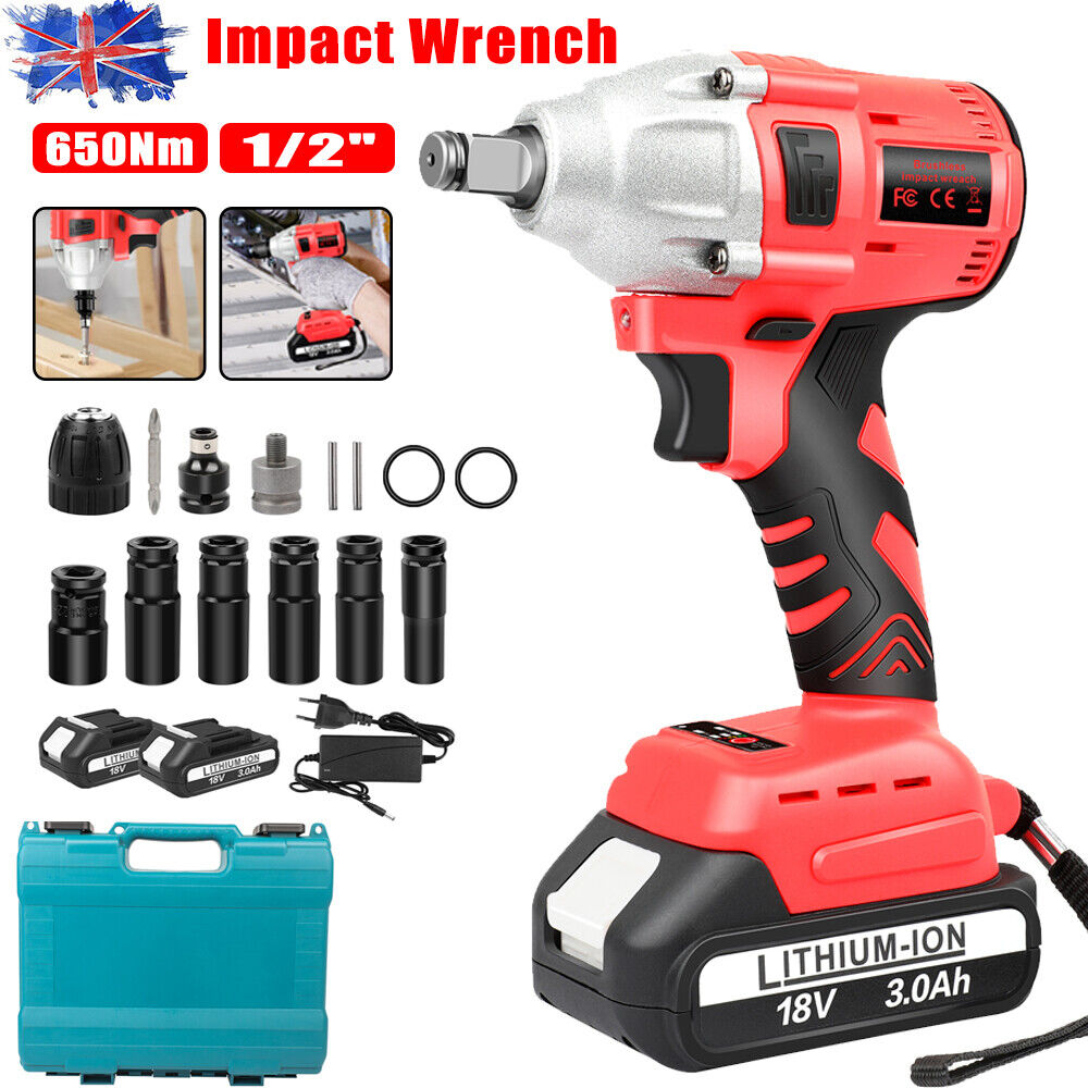 650Nm 21V Cordless Electric Impact Wrench Gun Drill Driver & Socket W/ 2 Battery