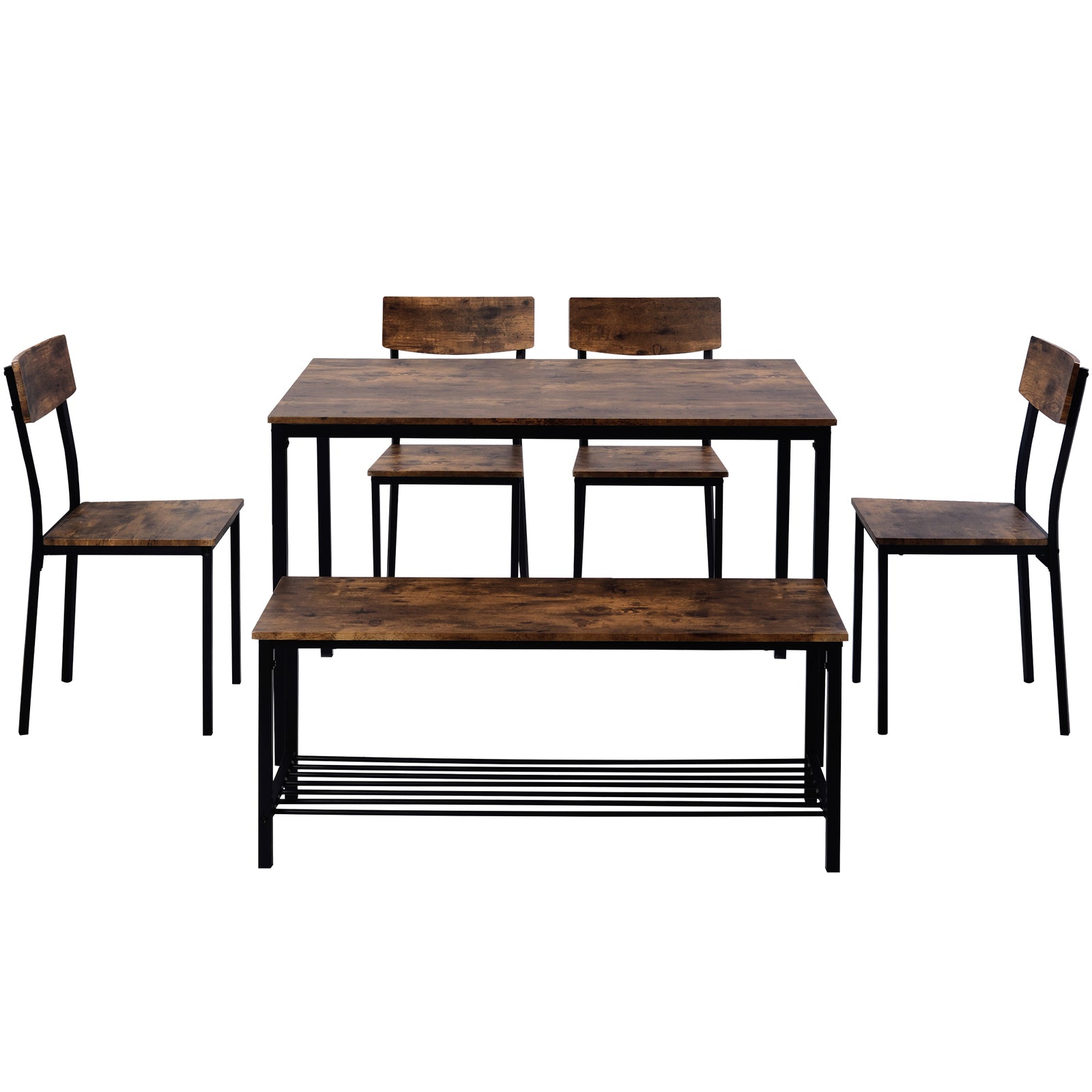 6Pc Kitchen Dining Table Chair and Bench Set Wooden Steel Frame Industrial Style