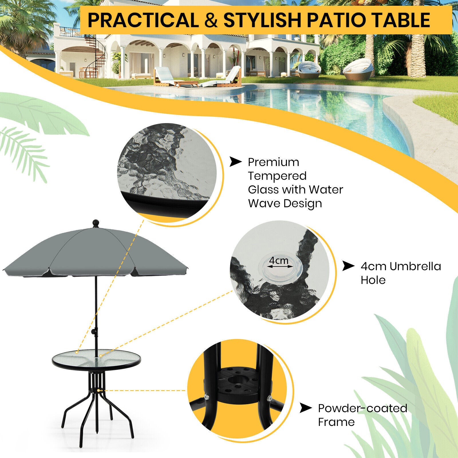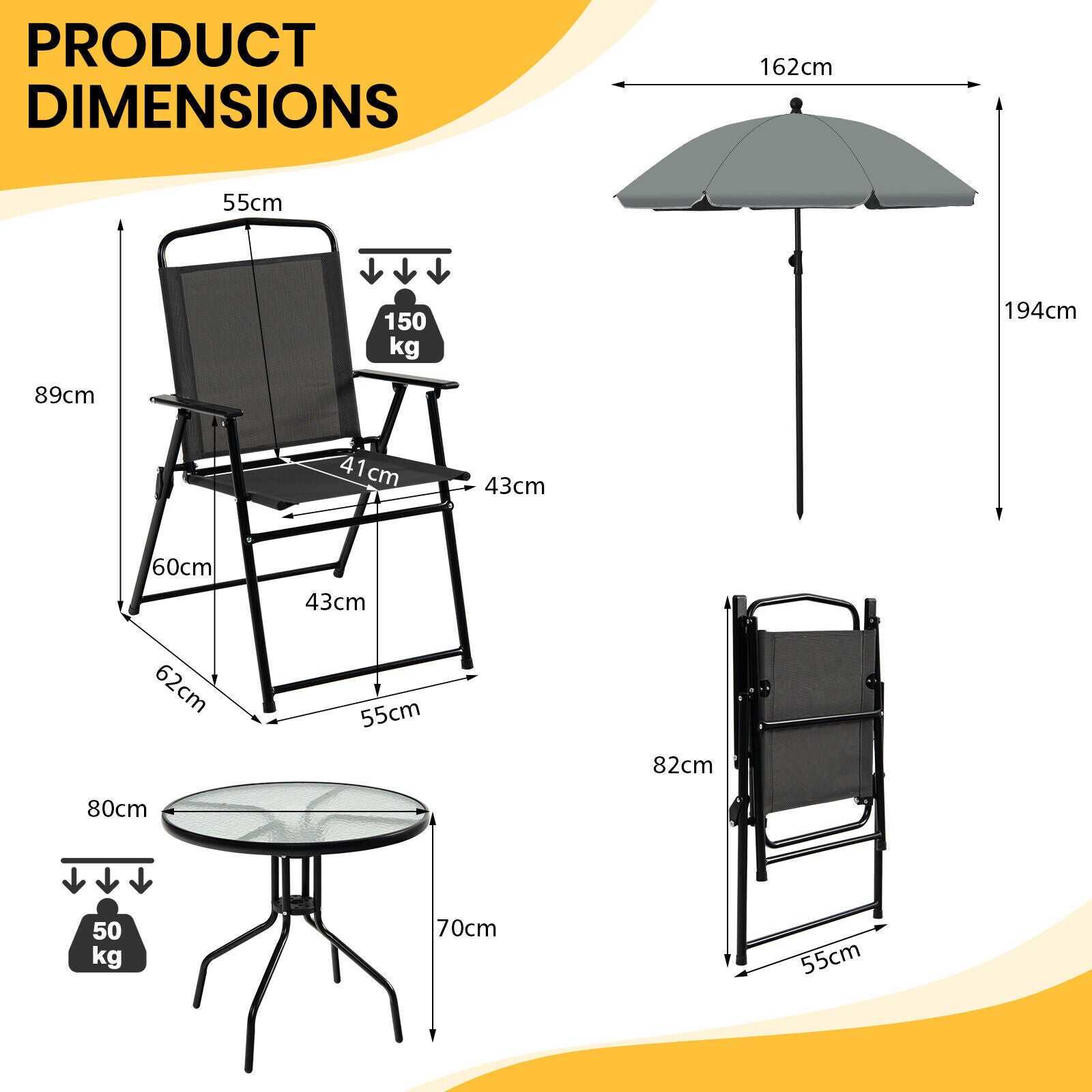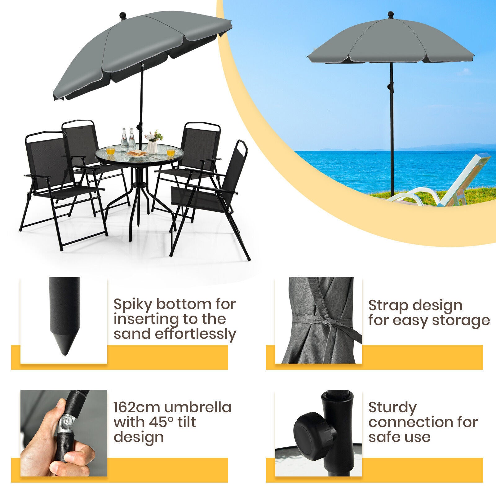 6PCS Garden Furniture Set Patio Coffee Table Folding Chairs Set W/Grey Parasol