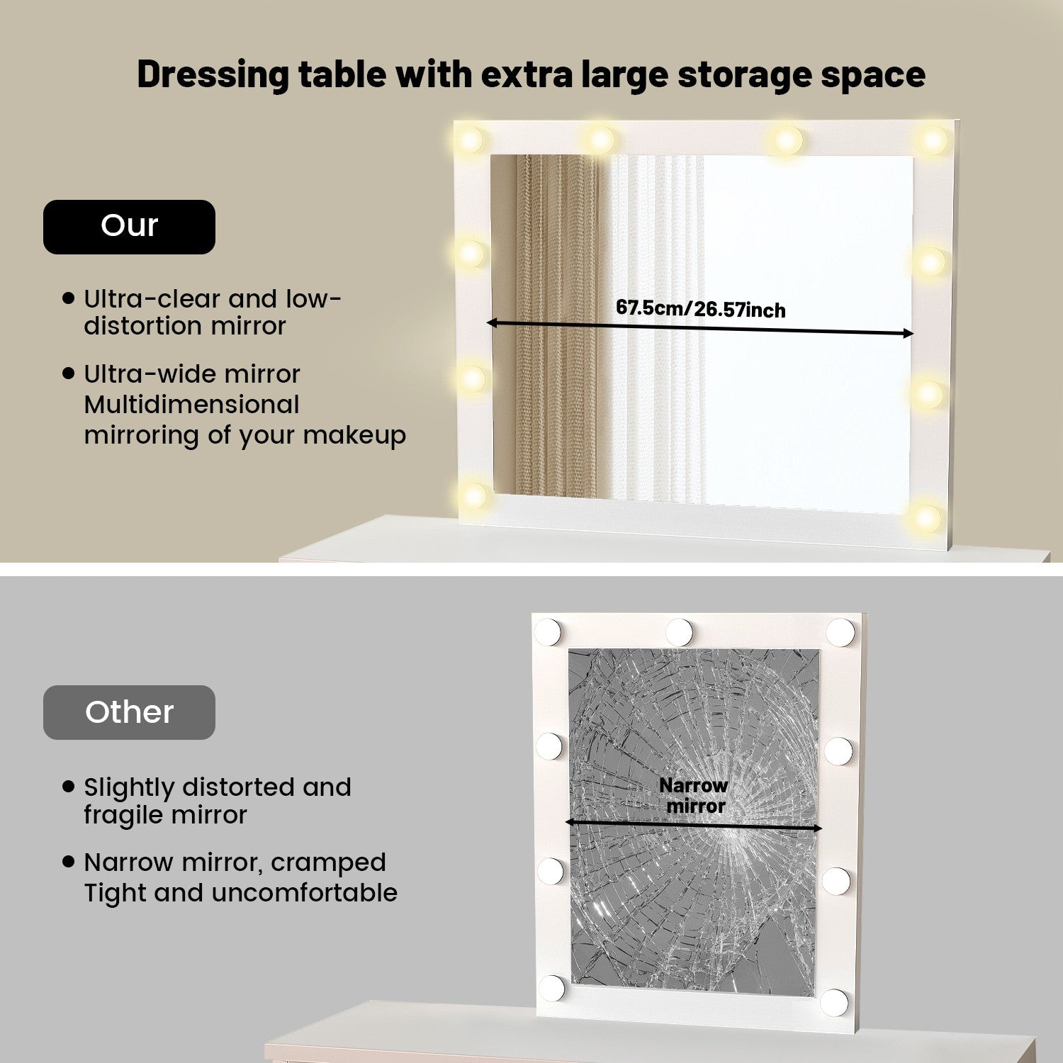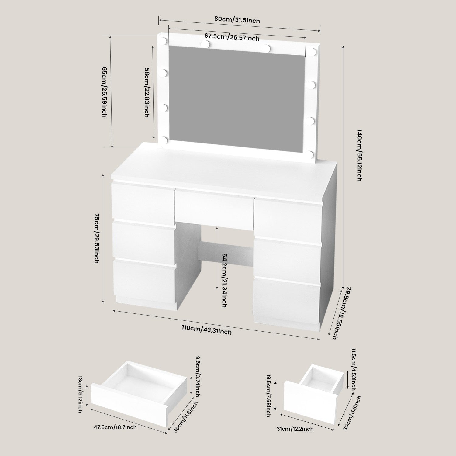 7 Drawer Dressing Table Wood Makeup Desk with Hollywood LED Mirror Bedroom-White