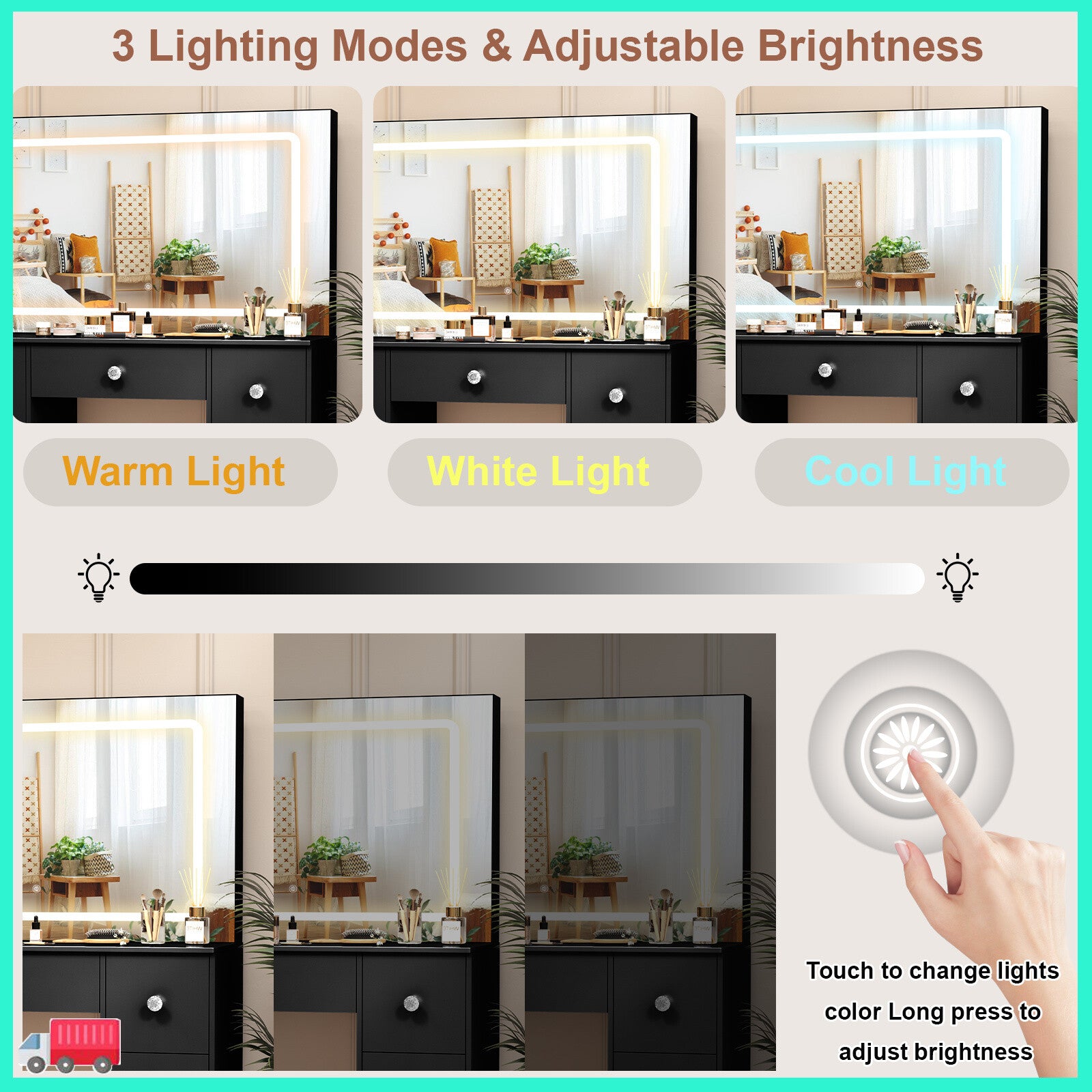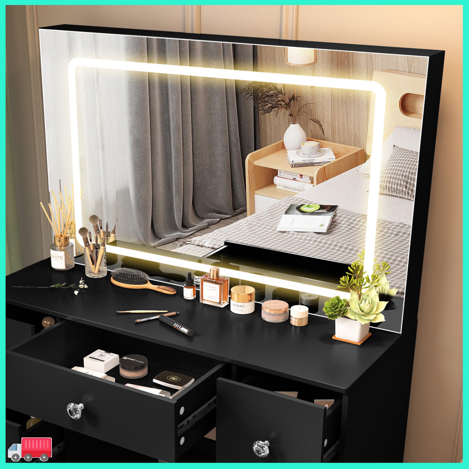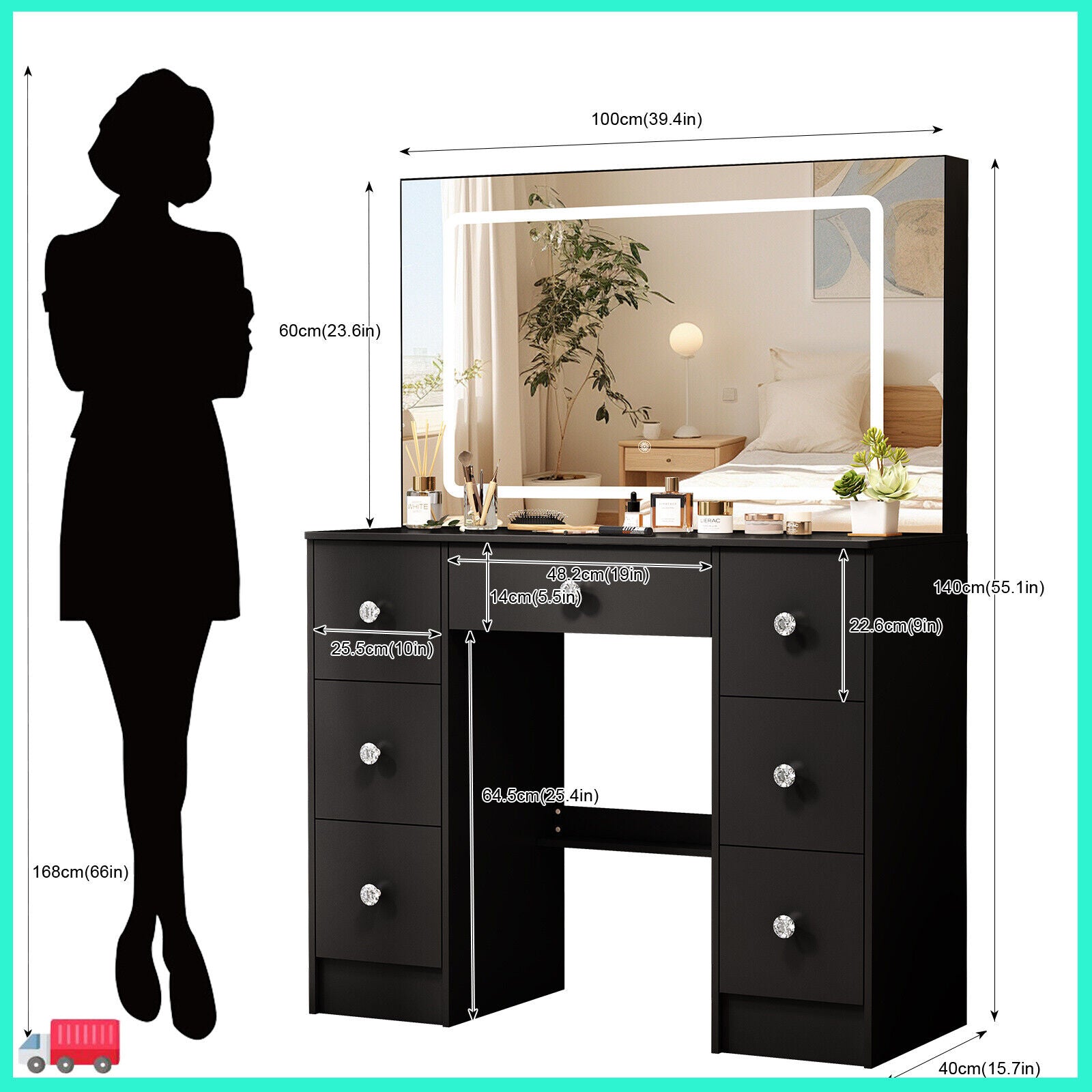 7 Drawers Black Dressing Desk With LED Lighed Mirror Vanity Makeup Table Bedroom