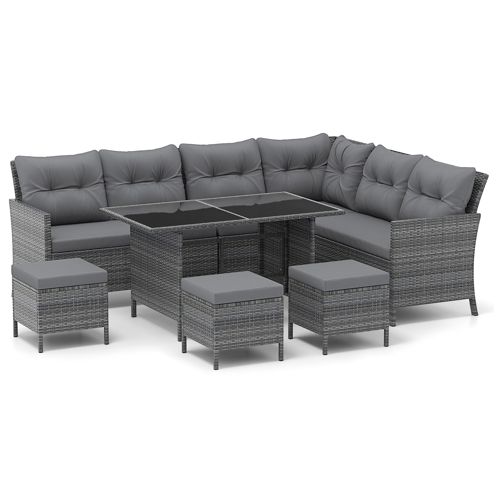 7 PCS Patio Dining Furniture PE Rattan Sectional Sofa Set with Ottomans Grey