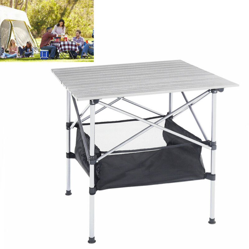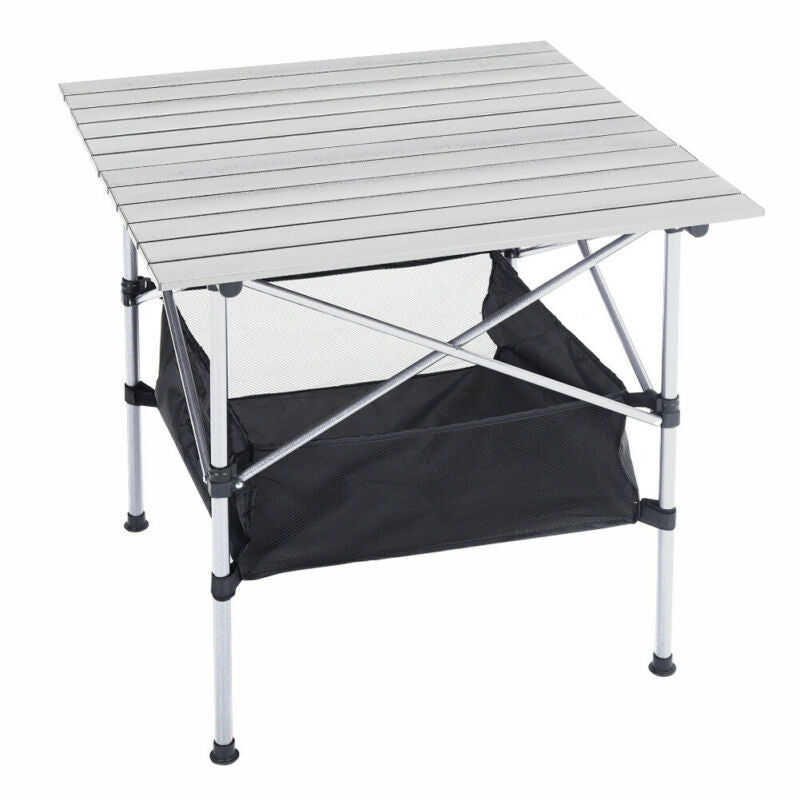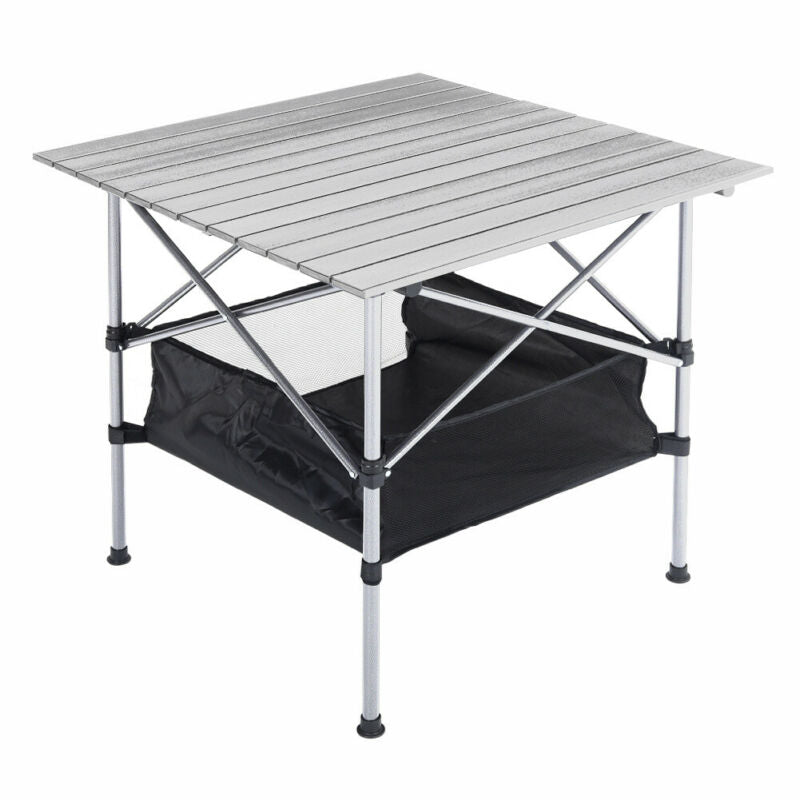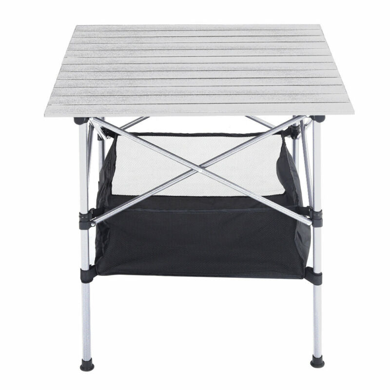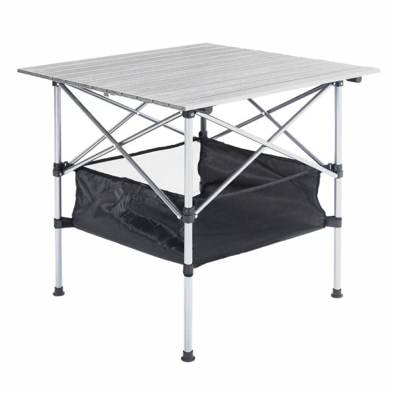 - Features: Foldable, Lightweight, Aluminum Tabletop and Frame, Weather Resistant, Waterproof, Rust Resistant, With Carry Bag, Portable, With Under Storage Basket
