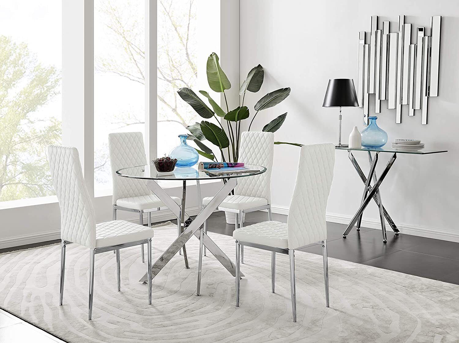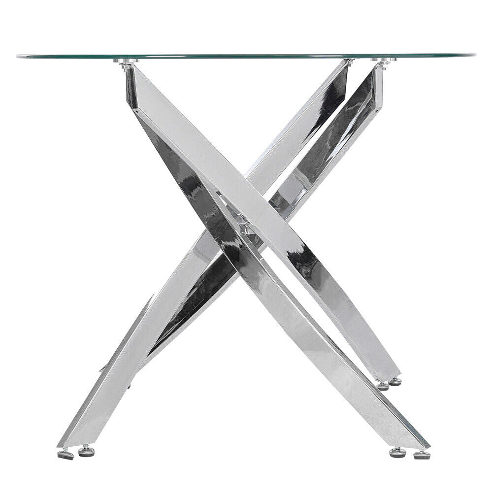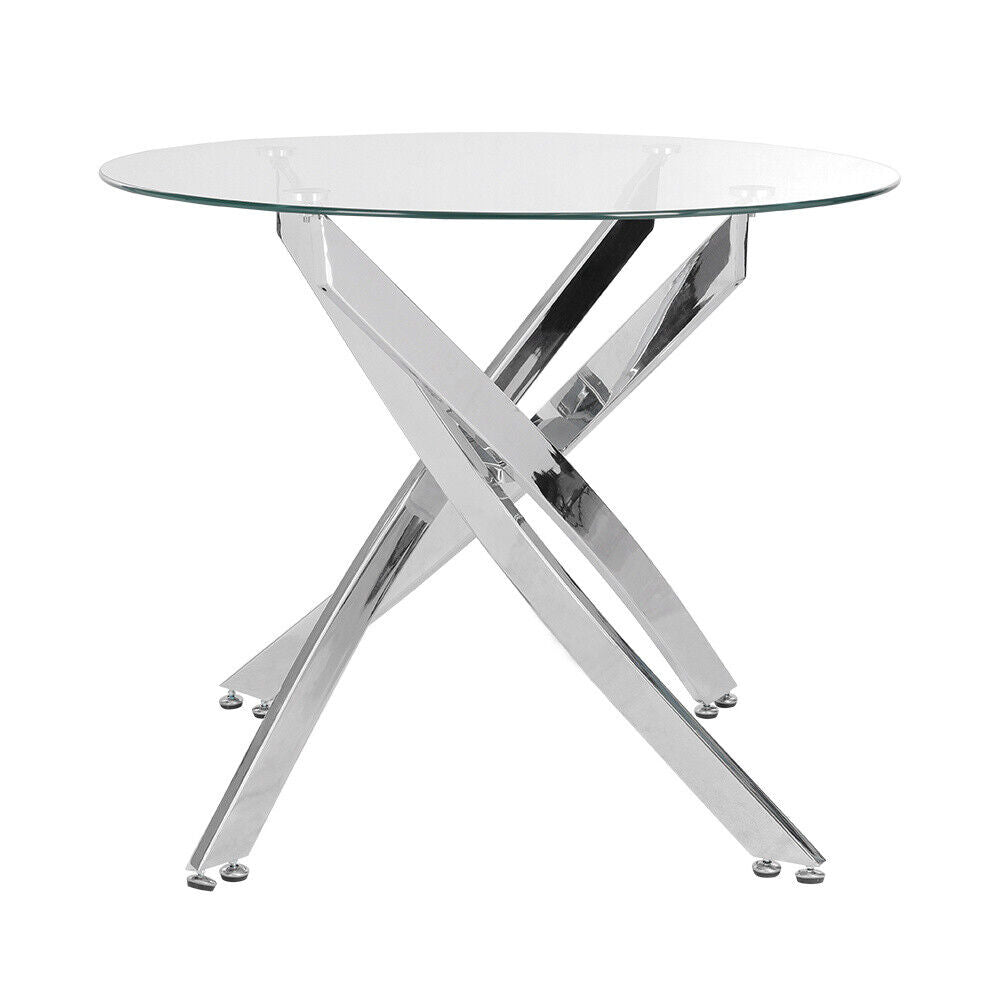 90cm Cross Round Glass Dining Table and 2/4 PU Leather Padded White Chairs Set