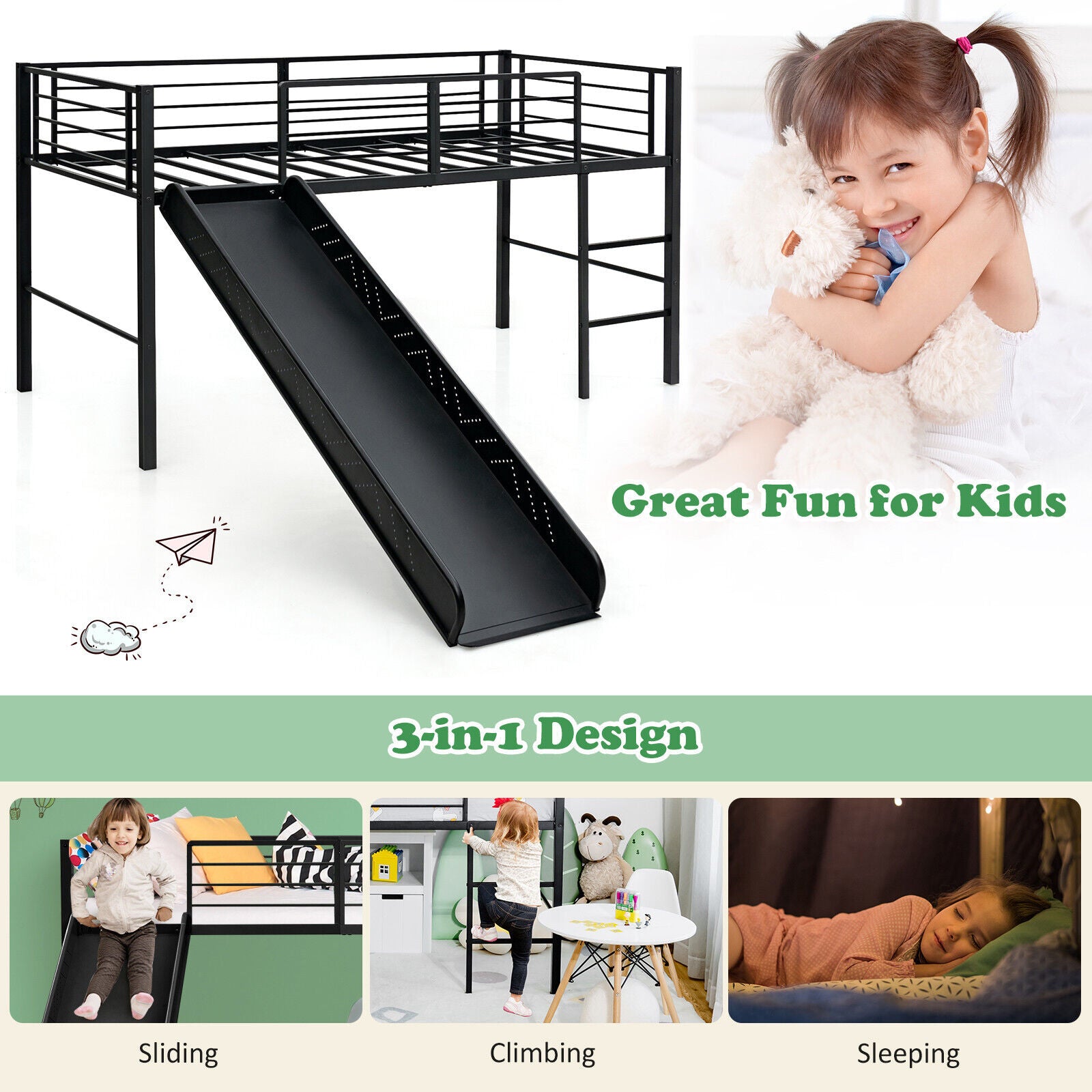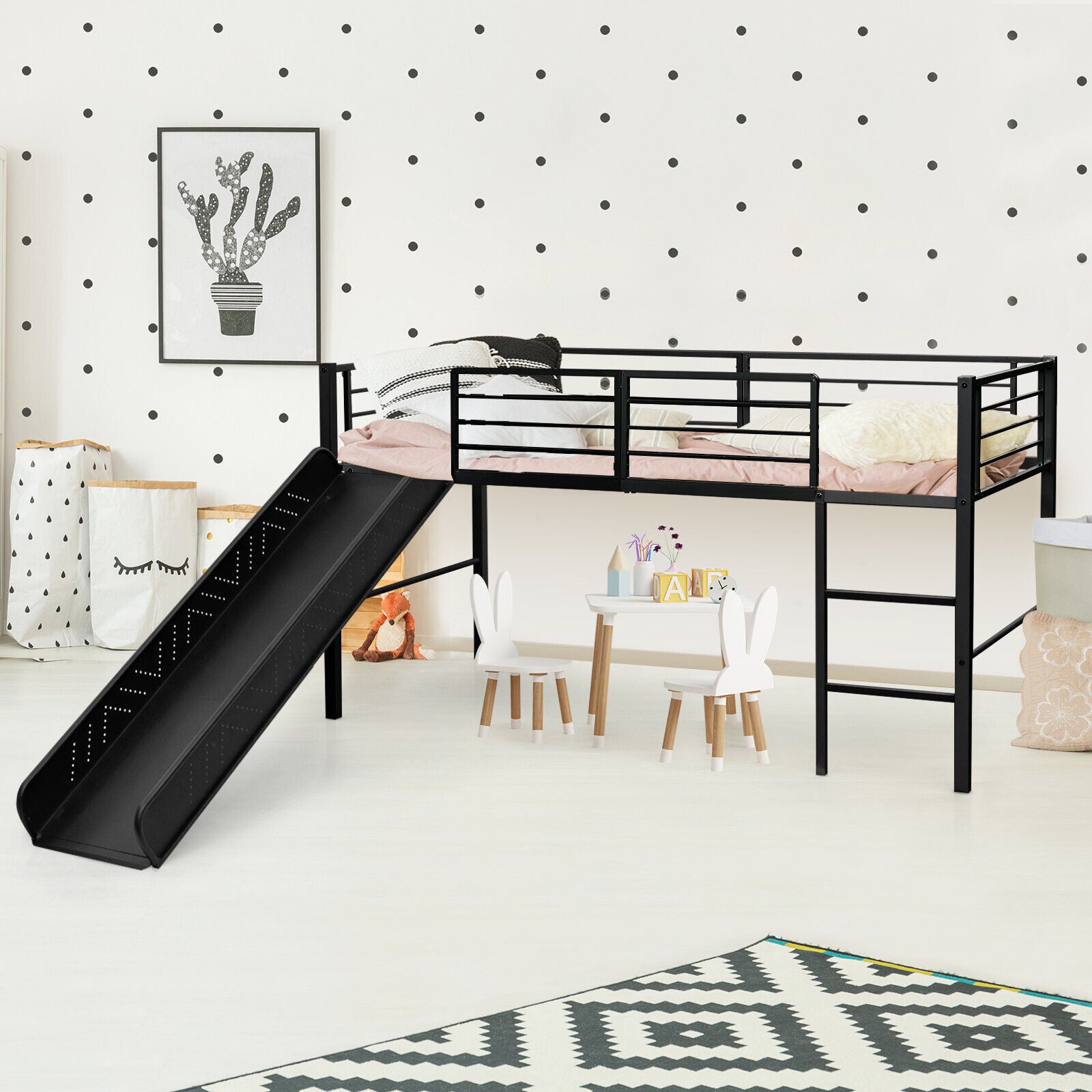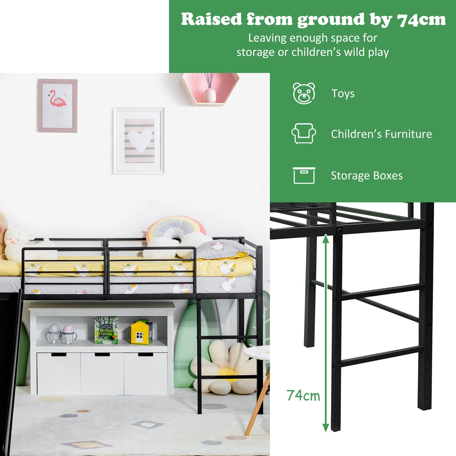 96CM Kids Low Loft Bed Frame Single Size Steel Bed Mid Sleeper w/Ladder & Slide