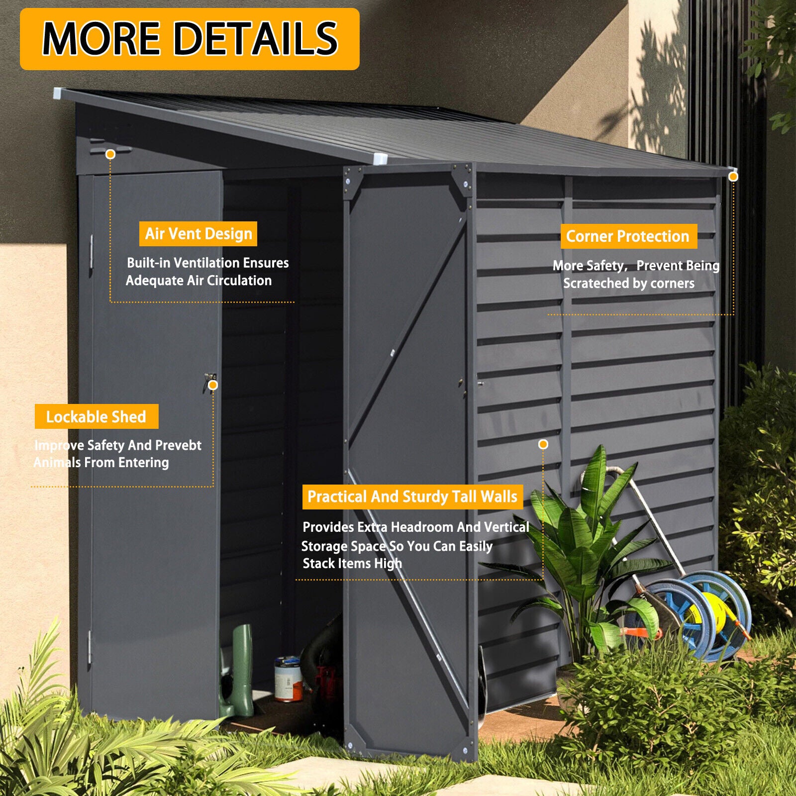 Features Corrosion Resistant, Durable, Easy Assembly, Heavy Duty, Lockable, Rust Resistant, UV Treated, Waterproof, With Hooks, Lean against the wall, Double Door