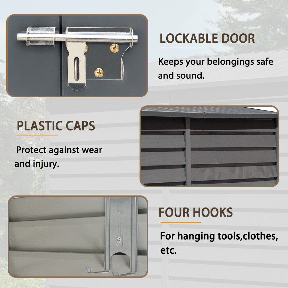 Features Corrosion Resistant, Durable, Easy Assembly, Heavy Duty, Lockable, Rust Resistant, UV Treated, Waterproof, With Hooks, Lean against the wall, Double Door