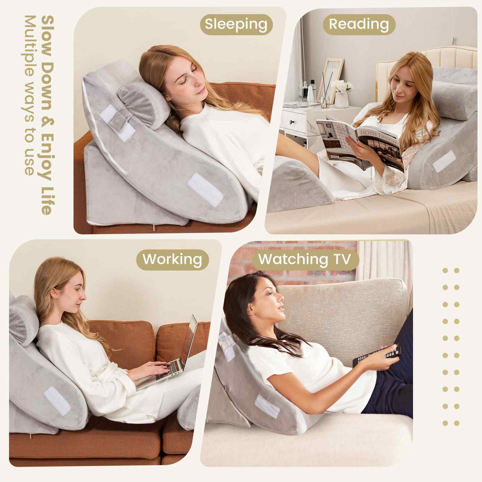 Adjustable Back Support Pillow 4pcs Bed Wedge Pillow w/ Removable Headrest