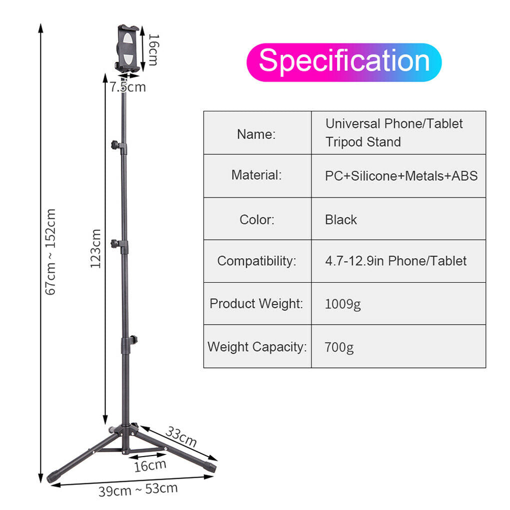 Adjustable Floor Tripod Stand Mount Tablet Holder 4 Section Poles For Ipad 12.9"